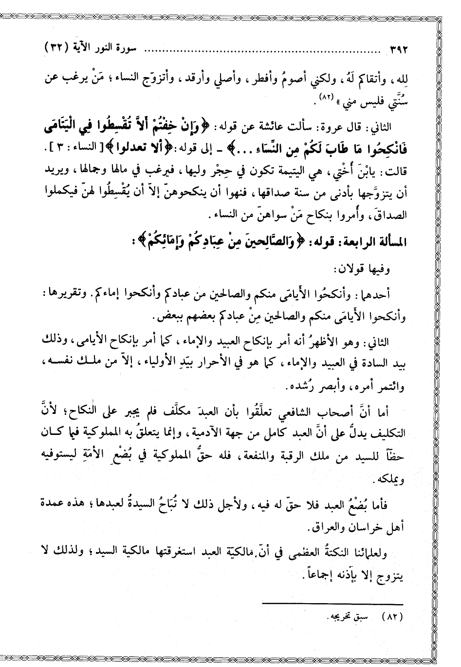 الثَّانِي: وَهُوَ الْأَظْهَرُ أَنَّهُ أَمَرَ بِإِنْكَاحِ الْعَبِيدِ وَالْإِمَاءِ، كَمَا أَمَرَ بِإِنْكَاحِ الْأَيَامَى، وَذَلِكَ بِيَدِ السَّادَةِ فِي الْعَبِيدِ وَالْإِمَاءِ، كَمَا هُوَ فِي الْأَحْرَارِ بِيَدِ الْأَوْلِيَاءِ، إلَّا مَنْ مَلَكَ نَفْسَهُ، وَائْتَمَرَ أَمْرَهُ، وَأَبْصَرَ رُشْدَهُ.