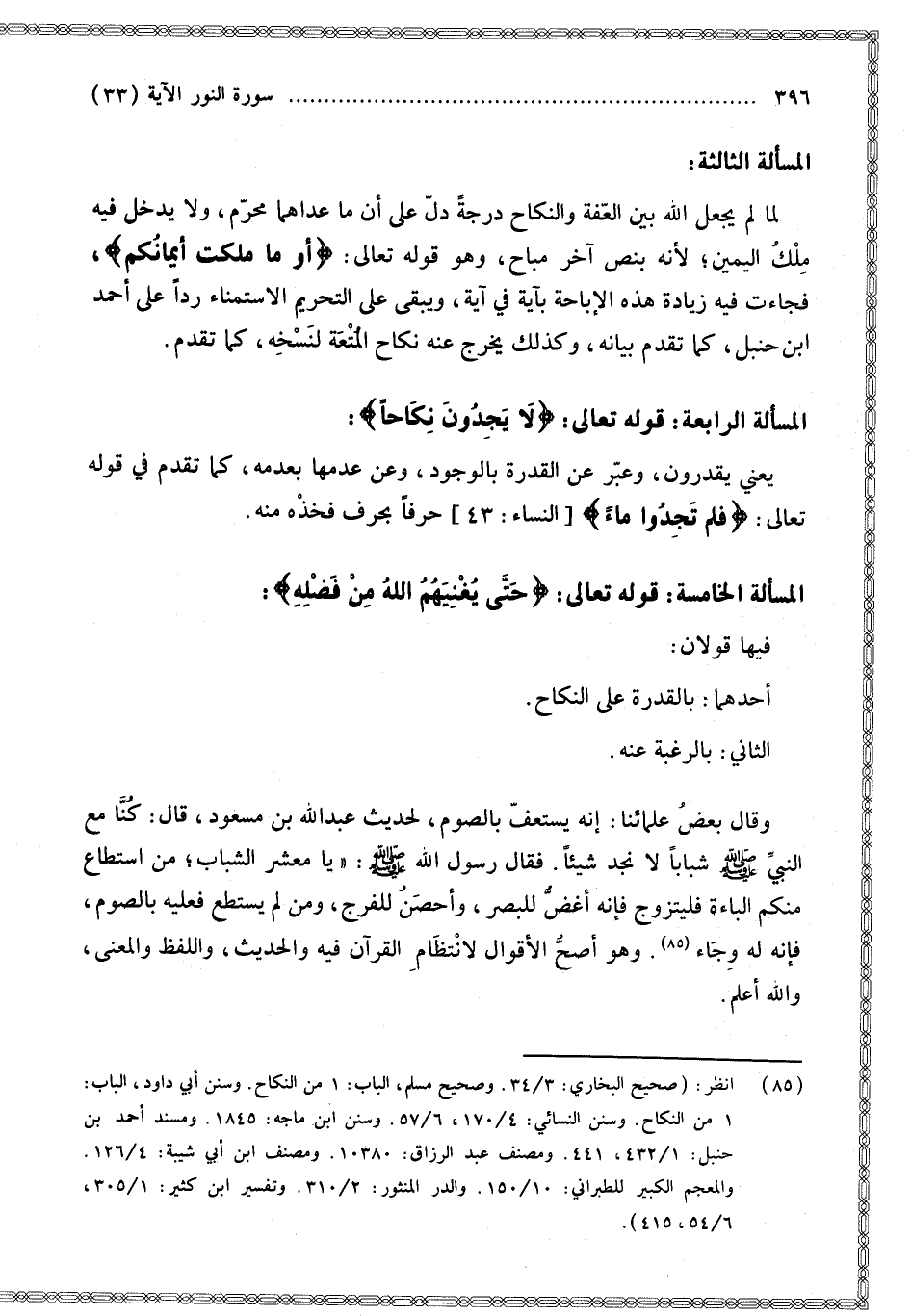 الْمَسْأَلَةُ الثَّالِثَةُ: لَمَّا لَمْ يَجْعَلْ اللَّهُ بَيْنَ الْعِفَّةِ وَالنِّكَاحِ دَرَجَةً دَلَّ عَلَى أَنَّ مَا عَدَاهُمَا مُحَرَّمٌ، وَلَا يَدْخُلُ فِيهِ مِلْكُ الْيَمِينِ؛ لِأَنَّهُ بِنَصٍّ آخَرَ مُبَاحٌ، وَهُوَ قَوْله تَعَالَى: {أَوْ مَا مَلَكَتْ أَيْمَانُكُمْ} [النساء: 3]، فَجَاءَتْ فِيهِ زِيَادَةُ هَذِهِ الْإِبَاحَةِ بِآيَةٍ فِي آيَةٍ، وَيَبْقَى عَلَى التَّحْرِيمِ الِاسْتِمْنَاءُ رَدًّا عَلَى أَحْمَدَ بْنِ حَنْبَلٍ، كَمَا تَقَدَّمَ بَيَانُهُ، وَكَذَلِكَ يَخْرُجُ عَنْهُ نِكَاحُ الْمُتْعَةِ لِنَسْخِهِ، كَمَا تَقَدَّمَ. الْمَسْأَلَةُ الرَّابِعَةُ: قَوْله تَعَالَى: {لا يَجِدُونَ نِكَاحًا} [النور: 33]