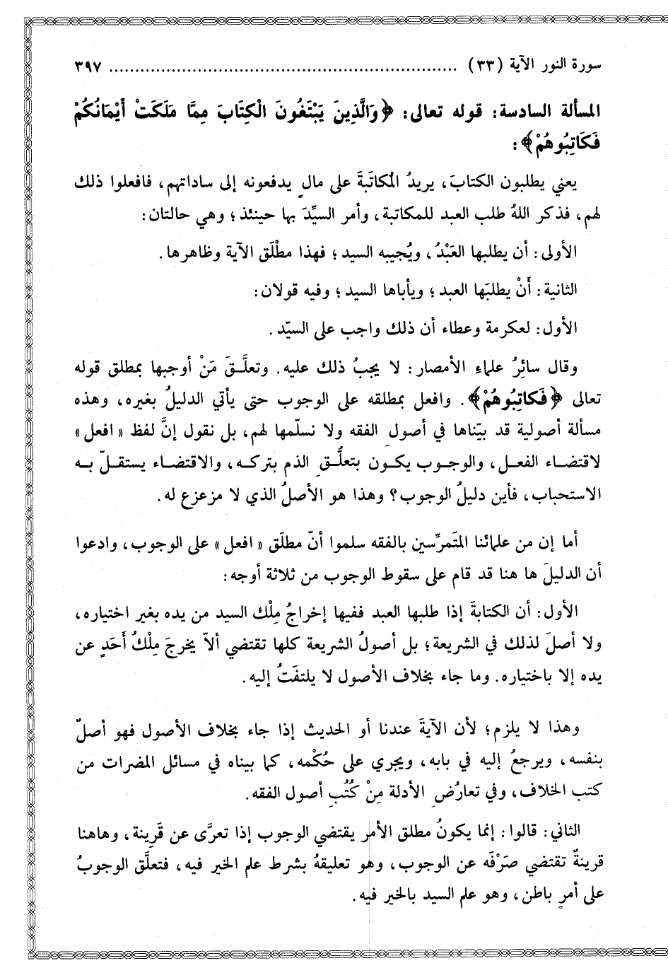 الْمَسْأَلَةُ السَّادِسَةُ: قَوْله تَعَالَى: {وَالَّذِينَ يَبْتَغُونَ الْكِتَابَ مِمَّا مَلَكَتْ أَيْمَانُكُمْ فَكَاتِبُوهُمْ} [النور: 33]