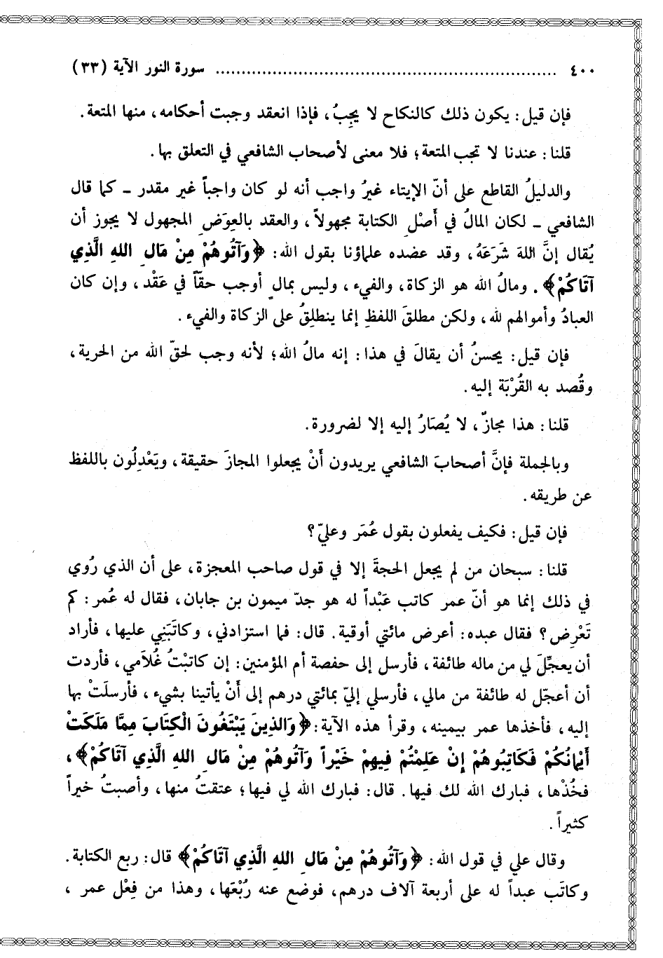 وَالدَّلِيلُ الْقَاطِعُ عَلَى أَنَّ الْإِيتَاءَ غَيْرُ وَاجِبٍ أَنَّهُ لَوْ كَانَ وَاجِبًا غَيْرَ مُقَدَّرٍ كَمَا قَالَ الشَّافِعِيُّ لَكَانَ الْمَالُ فِي أَصْلِ الْكِتَابَةِ مَجْهُولًا، وَالْعَقْدُ بِالْعِوَضِ الْمَجْهُولِ لَا يَجُوزُ أَنْ يُقَالَ إنَّ اللَّهَ شَرَعَهُ، وَقَدْ عَضَّدَهُ عُلَمَاؤُنَا بِقَوْلِ اللَّهِ: {وَآتُوهُمْ مِنْ مَالِ اللَّهِ الَّذِي آتَاكُمْ} [النور: 33]. وَمَالُ اللَّهِ هُوَ الزَّكَاةُ، وَالْفَيْءُ، وَلَيْسَ بِمَالٍ أَوْجَبَ حَقًّا فِي عَقْدٍ، وَإِنْ كَانَ الْعِبَادُ وَأَمْوَالُهُمْ لِلَّهِ، وَلَكِنَّ مُطْلَقَ اللَّفْظِ إنَّمَا يَنْطَلِقُ عَلَى الزَّكَاةِ وَالْفَيْءِ.