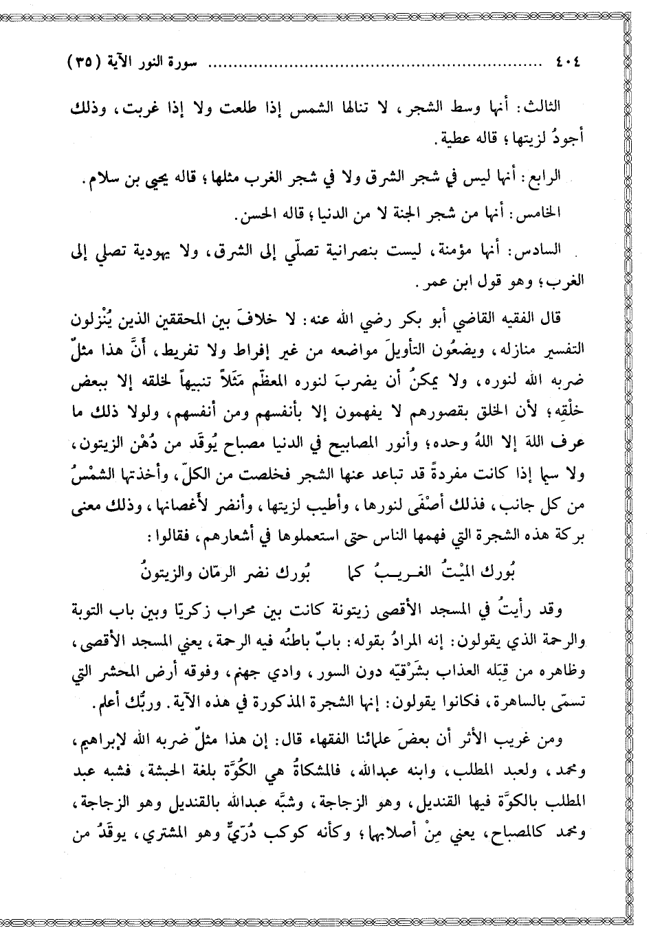 قَالَ الْفَقِيهُ الْقَاضِي أَبُو بَكْرٍ - رَضِيَ اللَّهُ عَنْهُ -: لَا خِلَافَ بَيْنَ الْمُحَقِّقِينَ الَّذِينَ يُنْزِلُونَ التَّفْسِيرَ مَنَازِلَهُ، وَيَضَعُونَ التَّأْوِيلَ مَوَاضِعَهُ مِنْ غَيْرِ إفْرَاطٍ وَلَا تَفْرِيطٍ، أَنَّ هَذَا مَثَلٌ ضَرَبَهُ اللَّهُ لِنُورِهِ، وَلَا يُمْكِنُ أَنْ يَضْرِبَ لِنُورِهِ الْمُعَظَّمَ مَثَلًا تَنْبِيهًا لِخَلْقِهِ إلَّا بِبَعْضِ خَلْقِهِ؛ لِأَنَّ الْخَلْقَ بِقُصُورِهِمْ لَا يَفْهَمُونَ إلَّا بِأَنْفُسِهِمْ وَمِنْ أَنْفُسِهِمْ، وَلَوْلَا ذَلِكَ مَا عَرَفَ اللَّهَ إلَّا اللَّهُ وَحْدَهُ، وَأَنْوَرُ الْمَصَابِيحِ فِي الدُّنْيَا مِصْبَاحٌ يُوقَدُ مِنْ دُهْنِ الزَّيْتُونِ، وَلَا سِيَّمَا إذَا كَانَتْ مُفْرَدَةً قَدْ تَبَاعَدَ عَنْهَا الشَّجَرُ فَخَلَصَتْ مِنْ الْكُلِّ، وَأَخَذَتْهَا الشَّمْسُ مِنْ كُلِّ جَانِبٍ، فَذَلِكَ أَصْفَى لِنُورِهَا، وَأَطْيَبُ لِزَيْتِهَا، وَأَنْضَرُ لِأَغْصَانِهَا، وَذَلِكَ مَعْنَى بَرَكَةِ هَذِهِ الشَّجَرَةِ الَّتِي فَهِمَهَا النَّاسُ حَتَّى اسْتَعْمَلُوهَا فِي أَشْعَارِهِمْ، فَقَالُوا: