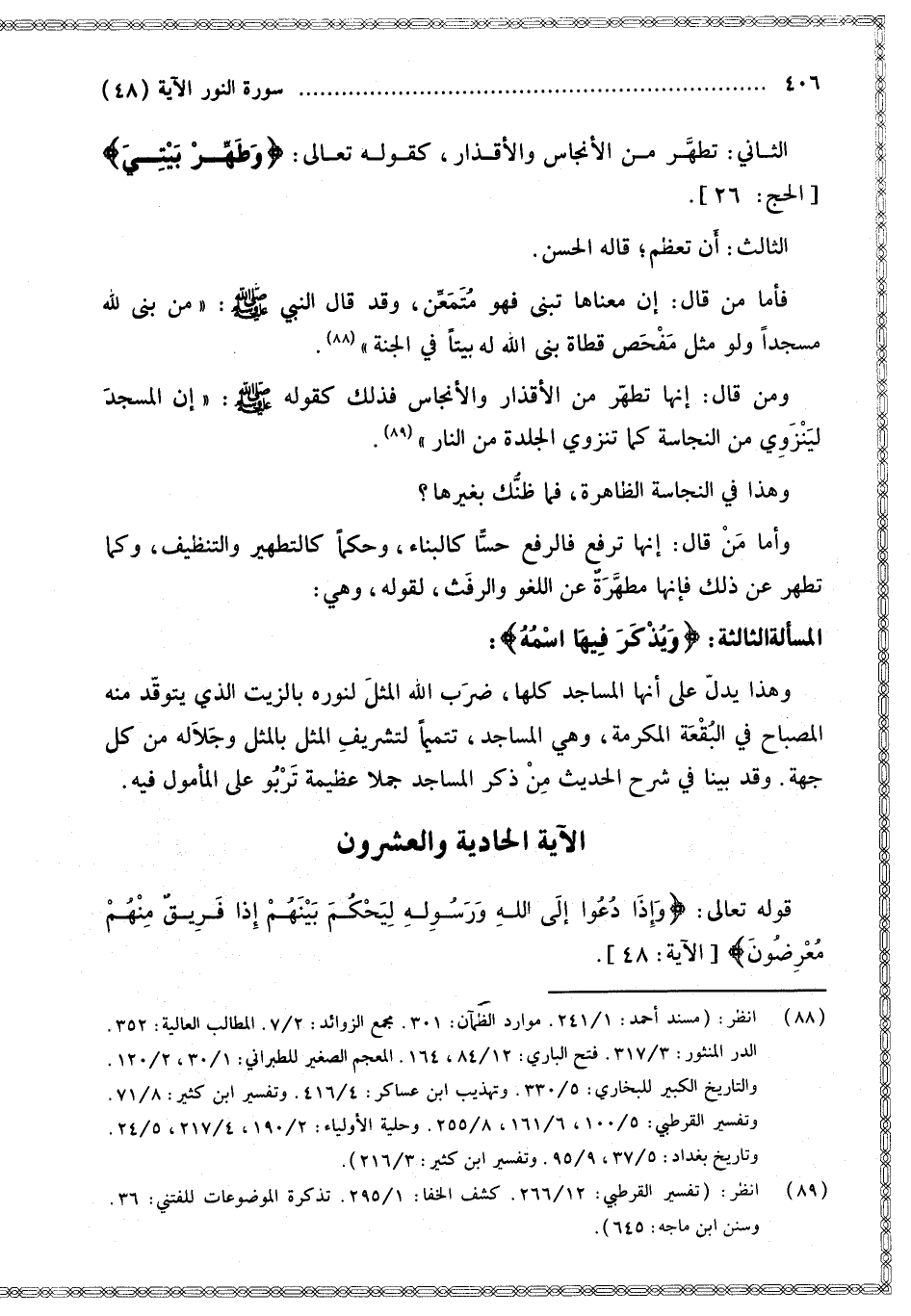 الْمَسْأَلَةُ الثَّالِثَةُ: {وَيُذْكَرَ فِيهَا اسْمُهُ} [النور: 36] وَهَذَا يَدُلُّ عَلَى أَنَّهَا الْمَسَاجِدُ كُلُّهَا، ضَرَبَ اللَّهُ الْمَثَلَ لِنُورِهِ بِالزَّيْتِ الَّذِي يَتَوَقَّدُ مِنْهُ الْمِصْبَاحُ فِي الْبُقْعَةِ الْمُكَرَّمَةِ، وَهِيَ الْمَسَاجِدُ، تَتْمِيمًا لِتَشْرِيفِ الْمَثَلِ بِالْمَثَلِ وَجَلَالِهِ مِنْ كُلِّ جِهَةٍ. وَقَدْ بَيَّنَّا فِي شَرْحِ الْحَدِيثِ مِنْ ذِكْرِ الْمَسَاجِدِ جُمَلًا عَظِيمَةً تَرْبُو عَلَى الْمَأْمُولِ فِيهِ.