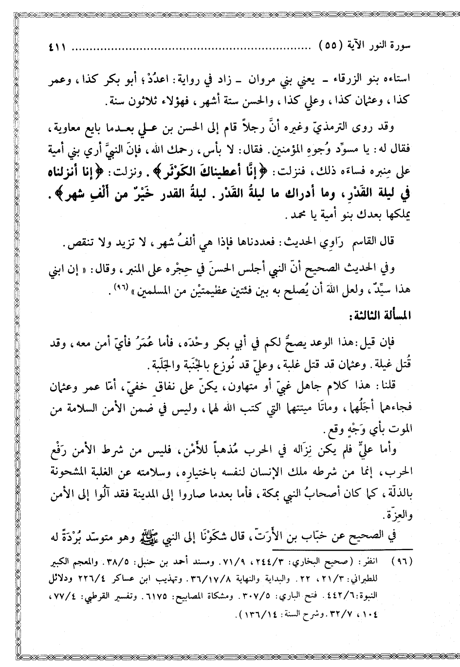 وَقَدْ رَوَى التِّرْمِذِيُّ وَغَيْرُهُ «أَنَّ رَجُلًا قَامَ إلَى الْحَسَنِ بْنِ عَلِيٍّ بَعْدَمَا بَايَعَ مُعَاوِيَةَ، فَقَالَ لَهُ: يَا مُسَوِّدَ وُجُوهِ الْمُؤْمِنِينَ. فَقَالَ: لَا بَأْسَ، رَحِمَك اللَّهُ، فَإِنَّ النَّبِيَّ أُرِيَ بَنِي أُمَيَّةَ عَلَى مِنْبَرِهِ فَسَاءَهُ ذَلِكَ، فَنَزَلَتْ: {إِنَّا أَعْطَيْنَاكَ الْكَوْثَرَ} [الكوثر: 1]. وَنَزَلَتْ: {إِنَّا أَنْزَلْنَاهُ فِي لَيْلَةِ الْقَدْرِ} [القدر: 1] {وَمَا أَدْرَاكَ مَا لَيْلَةُ الْقَدْرِ} [القدر: 2] {لَيْلَةُ الْقَدْرِ خَيْرٌ مِنْ أَلْفِ شَهْرٍ} [القدر: 3].»