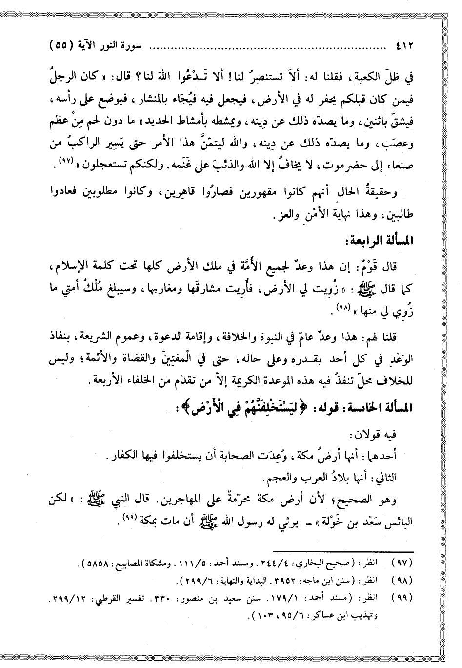 قَالَ قَوْمٌ: إنَّ هَذَا وَعْدٌ لِجَمِيعِ الْأُمَّةِ فِي مِلْكِ الْأَرْضِ كُلِّهَا تَحْتَ كَلِمَةِ الْإِسْلَامِ، كَمَا قَالَ - صَلَّى اللَّهُ عَلَيْهِ وَسَلَّمَ -: «زُوِيَتْ لِي الْأَرْضُ، فَأُرِيت مَشَارِقَهَا وَمَغَارِبَهَا، وَسَيَبْلُغُ مُلْكُ أُمَّتِي مَا زُوِيَ لِي مِنْهَا».