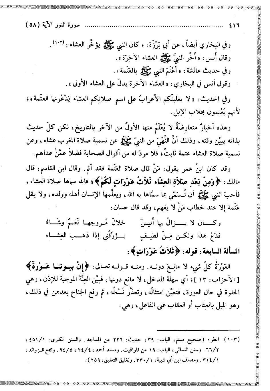 وَقَدْ كَانَ ابْنُ عُمَرَ يَقُولُ: مَنْ قَالَ صَلَاةُ الْعَتَمَةِ فَقَدْ أَثِمَ. وَقَالَ ابْنُ الْقَاسِمِ: قَالَ مَالِكٌ: {وَمِنْ بَعْدِ صَلاةِ الْعِشَاءِ ثَلاثُ عَوْرَاتٍ لَكُمْ} [النور: 58] فَاَللَّهُ سَمَّاهَا صَلَاةَ الْعِشَاءِ، فَأَحَبَّ النَّبِيُّ - صَلَّى اللَّهُ عَلَيْهِ وَسَلَّمَ - أَنْ تُسَمَّى بِمَا سَمَّاهَا بِهِ اللَّهُ، وَيُعَلِّمُهَا الْإِنْسَانُ أَهْلَهُ وَوَلَدَهُ، وَلَا يَقُلْ عَتَمَةً إلَّا عِنْدَ خِطَابِ مَنْ لَا يَفْهَمُ، وَقَدْ قَالَ حَسَّانُ: