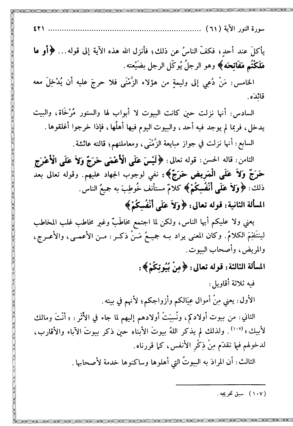 يَعْنِي وَلَا عَلَيْكُمْ أَيُّهَا النَّاسُ، وَلَكِنْ لَمَّا اجْتَمَعَ مُخَاطَبٌ وَغَيْرُ مُخَاطَبٍ غَلَبَ الْمُخَاطَبُ لِيَنْتَظِمَ الْكَلَامُ. وَكَانَ الْمَعْنَى يُرَادُ بِهِ جَمِيعُ مَنْ ذُكِرَ: مِنْ الْأَعْمَى، وَالْأَعْرَجِ، وَالْمَرِيضِ، وَأَصْحَابِ الْبُيُوتِ. الْمَسْأَلَةُ الثَّالِثَةُ: قَوْله تَعَالَى: {مِنْ بُيُوتِكُمْ} [النور: 61]