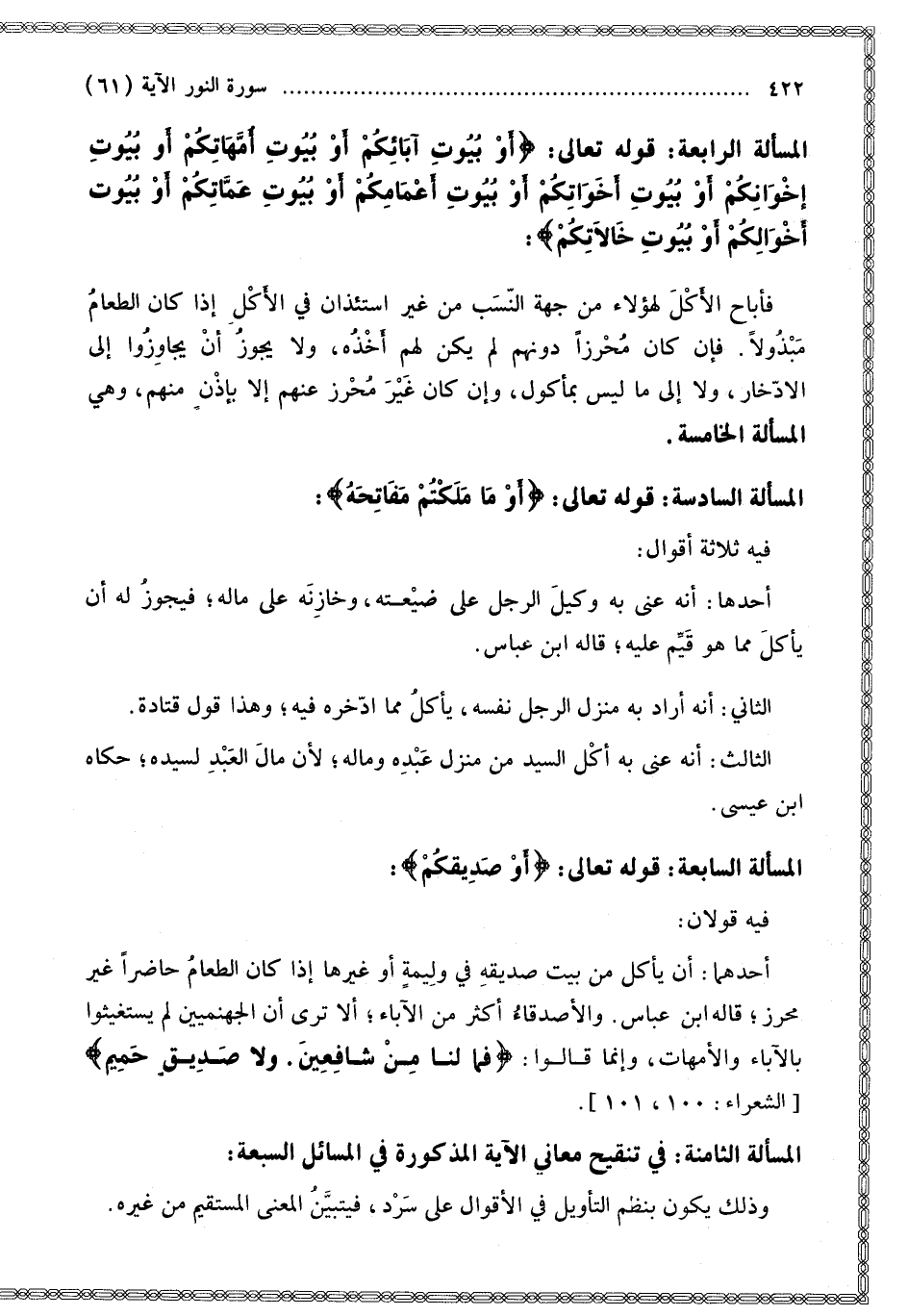 الْمَسْأَلَةُ الرَّابِعَةُ: قَوْله تَعَالَى {أَوْ بُيُوتِ آبَائِكُمْ أَوْ بُيُوتِ أُمَّهَاتِكُمْ أَوْ بُيُوتِ إِخْوَانِكُمْ أَوْ بُيُوتِ أَخَوَاتِكُمْ أَوْ بُيُوتِ أَعْمَامِكُمْ أَوْ بُيُوتِ عَمَّاتِكُمْ أَوْ بُيُوتِ أَخْوَالِكُمْ أَوْ بُيُوتِ خَالاتِكُمْ} [النور: 61]