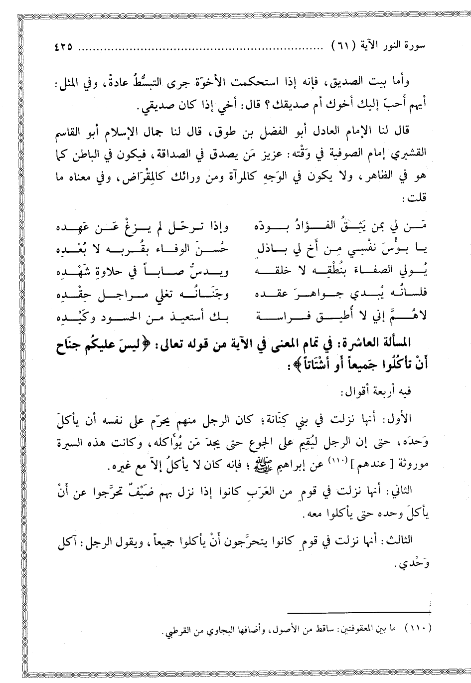 قَالَ لَنَا الْإِمَامُ الْعَادِلُ أَبُو الْفَضْلِ بْنُ طَوْقٍ قَالَ لَنَا جَمَالُ الْإِسْلَامِ أَبُو الْقَاسِمِ الْقُشَيْرِيُّ إمَامُ الصُّوفِيَّةِ فِي وَقْتِهِ: عَزِيزٌ مِنْ يَصْدُقُ فِي الصَّدَاقَةِ، فَيَكُونُ فِي الْبَاطِنِ كَمَا هُوَ فِي الظَّاهِرِ، وَلَا يَكُونُ فِي الْوَجْهِ كَالْمِرْآةِ وَمِنْ وَرَائِك كَالْمِقْرَاضِ، وَفِي مَعْنَاهُ مَا قُلْت: