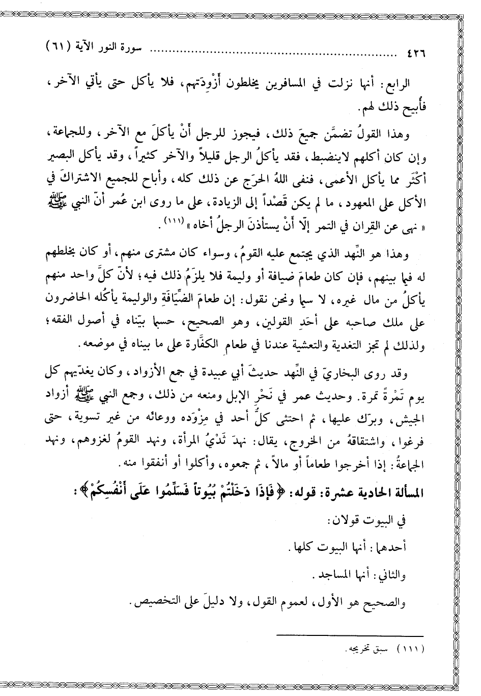 وَهَذَا الْقَوْلُ تَضَمَّنَ جَمِيعَ ذَلِكَ، فَيَجُوزُ لِلرَّجُلِ أَنْ يَأْكُلَ مَعَ الْآخَرِ، وَلِلْجَمَاعَةِ، وَإِنْ كَانَ أَكْلُهُمْ لَا يَنْضَبِطُ، فَقَدْ يَأْكُلُ الرَّجُلُ قَلِيلًا وَالْآخَرُ كَثِيرًا، وَقَدْ يَأْكُلُ الْبَصِيرُ أَكْثَرَ مِمَّا يَأْكُلُ الْأَعْمَى، فَنَفَى اللَّهُ الْحَرَجَ عَنْ ذَلِكَ كُلِّهِ، وَأَبَاحَ لِلْجَمِيعِ الِاشْتِرَاكَ فِي الْأَكْلِ عَلَى الْمَعْهُودِ، مَا لَمْ يَكُنْ قَصْدًا إلَى الزِّيَادَةِ، عَلَى مَا رَوَى ابْنُ عُمَرَ أَنَّ النَّبِيَّ - صَلَّى اللَّهُ عَلَيْهِ وَسَلَّمَ - «نَهَى عَنْ الْقِرَانِ فِي التَّمْرِ إلَّا أَنْ يَسْتَأْذِنَ الرَّجُلُ أَخَاهُ».