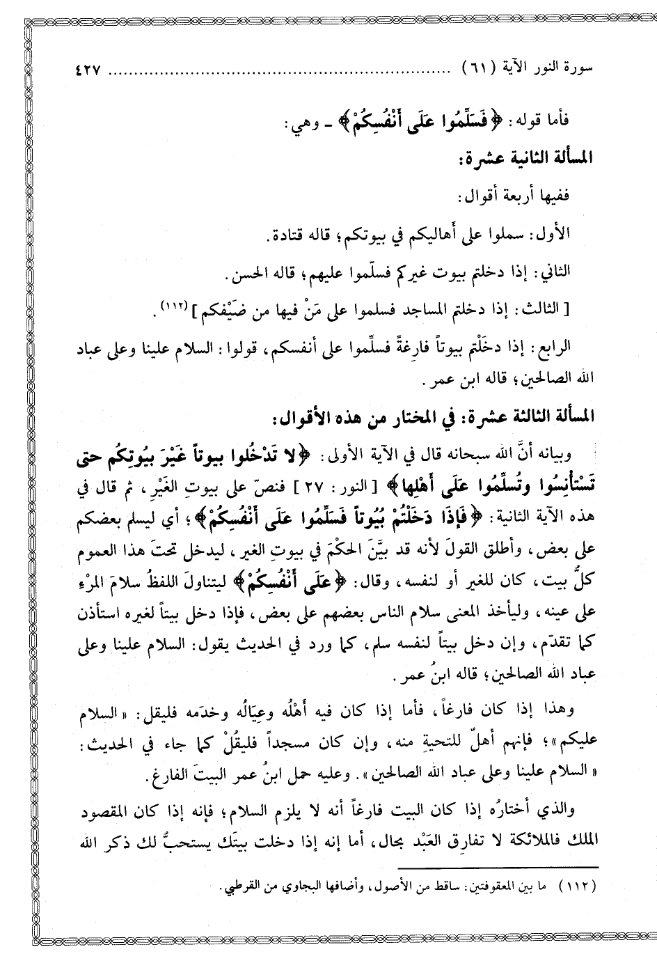 فَأَمَّا قَوْلُهُ: {فَسَلِّمُوا عَلَى أَنْفُسِكُمْ} [النور: 61] وَهِيَ: الْمَسْأَلَةُ الثَّانِيَةَ عَشْرَةَ: فِيهَا أَرْبَعَةُ أَقْوَالٍ: الْأَوَّلُ: سَلِّمُوا عَلَى أَهَالِيكُمْ فِي بُيُوتِكُمْ؛ قَالَهُ قَتَادَةُ.
