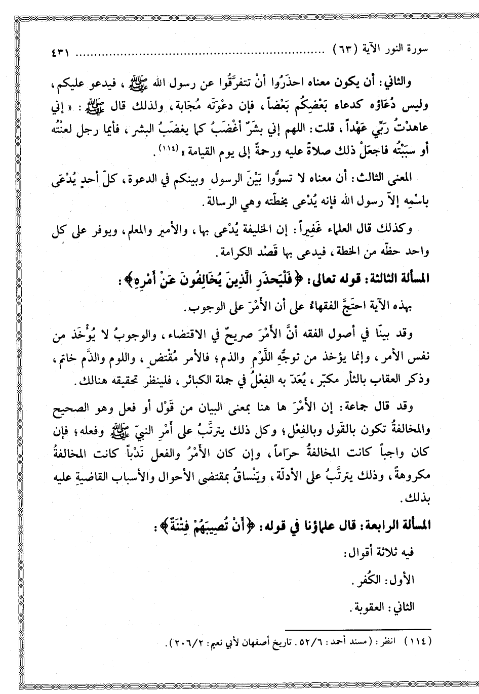 الْمَسْأَلَةُ الثَّالِثَةُ قَوْله تَعَالَى {فَلْيَحْذَرِ الَّذِينَ يُخَالِفُونَ عَنْ أَمْرِهِ} [النور: 63]