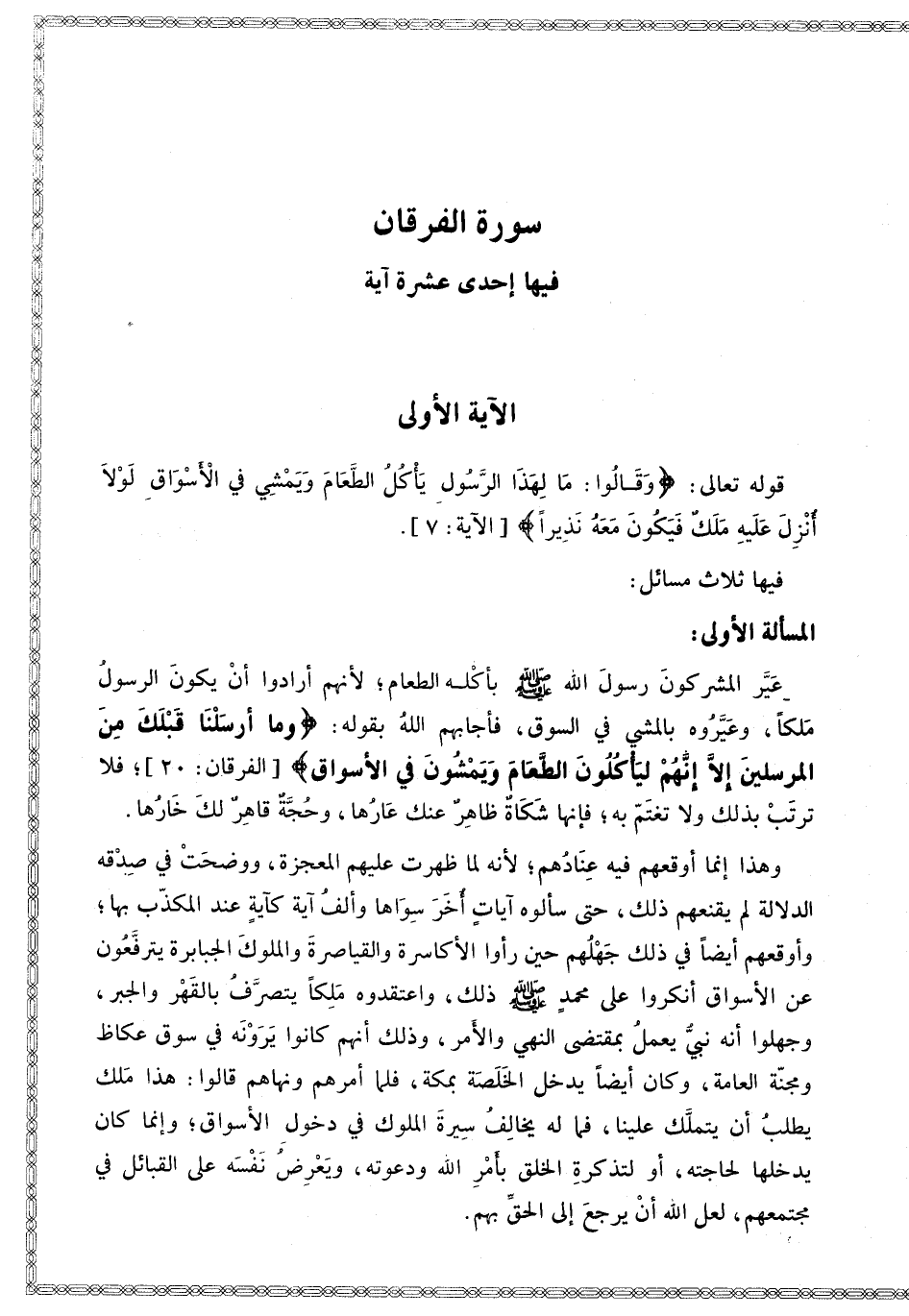 [سُورَةُ الْفُرْقَانِ فِيهَا إحْدَى عَشْرَةَ آيَةً] [الْآيَة الْأُولَى قَوْله تَعَالَى وَقَالُوا مَا لِهَذَا الرَّسُولِ يَأْكُلُ الطَّعَامَ وَيَمْشِي فِي الْأَسْوَاقِ]