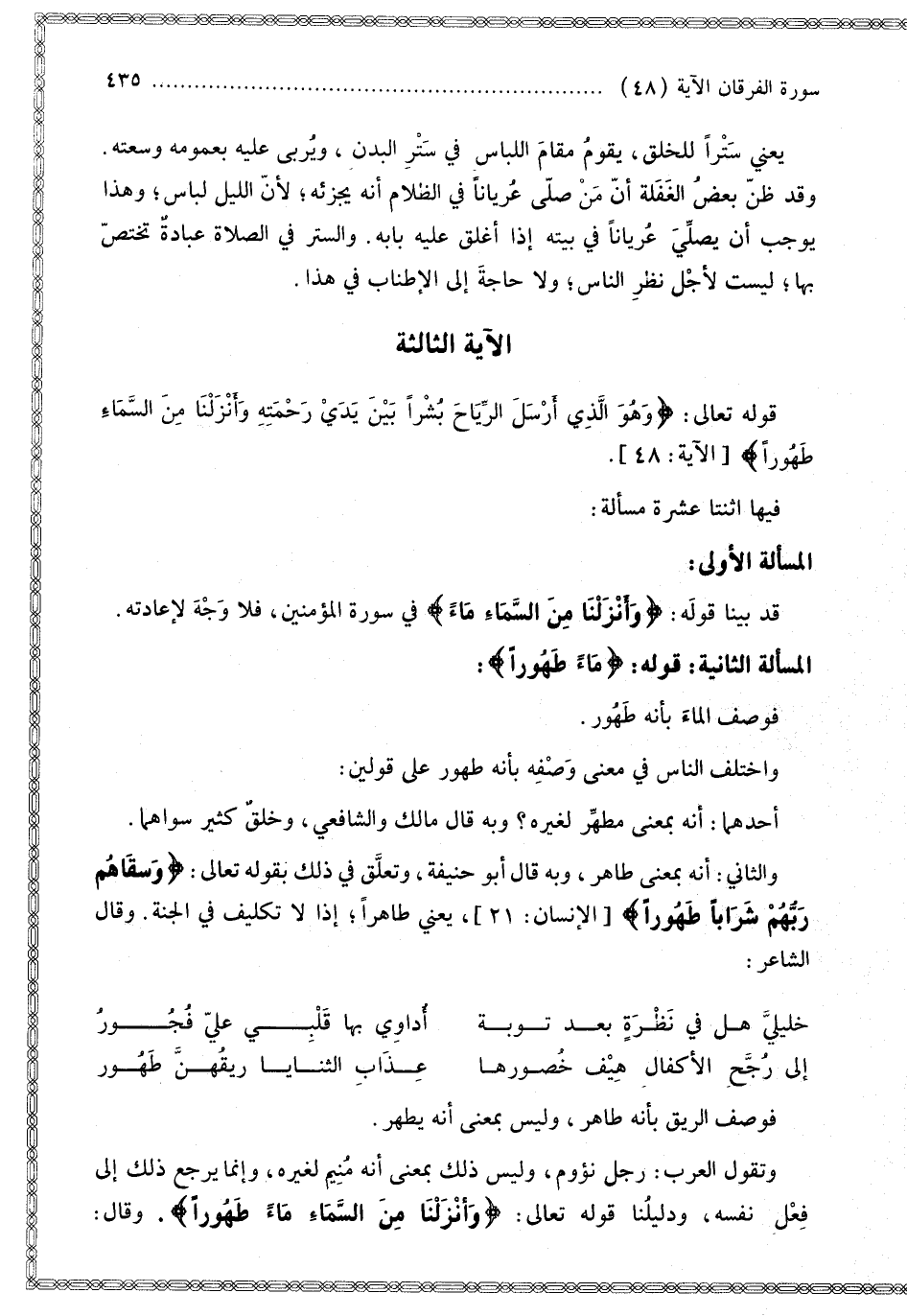 فِيهَا اثْنَتَا عَشْرَةَ مَسْأَلَةً: الْمَسْأَلَةُ الْأُولَى: قَدْ بَيَّنَّا قَوْلَهُ: {وَأَنْزَلْنَا مِنَ السَّمَاءِ مَاءً} [الفرقان: 48] فِي سُورَةِ الْمُؤْمِنِينَ، فَلَا وَجْهَ لِإِعَادَتِهِ. الْمَسْأَلَةُ الثَّانِيَةُ: قَوْلُهُ {مَاءً طَهُورًا} [الفرقان: 48] فَوَصَفَ الْمَاءَ بِأَنَّهُ طَهُورٌ. وَاخْتَلَفَ النَّاسُ فِي مَعْنَى وَصْفِهِ بِأَنَّهُ طَهُورٌ عَلَى قَوْلَيْنِ: أَحَدُهُمَا: أَنَّهُ بِمَعْنَى مُطَهِّرٌ لِغَيْرِهِ؟ وَبِهِ قَالَ مَالِكٌ وَالشَّافِعِيُّ، وَخَلْقٌ كَثِيرٌ سِوَاهُمَا.