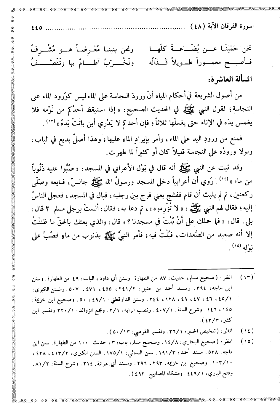الْمَسْأَلَةُ الْعَاشِرَةُ: مِنْ أُصُولِ الشَّرِيعَةِ فِي أَحْكَامِ الْمِيَاهِ أَنَّ وُرُودَ النَّجَاسَةِ عَلَى الْمَاءِ لَيْسَ كَوُرُودِ الْمَاءِ عَلَى النَّجَاسَةِ، لِقَوْلِ النَّبِيِّ - صَلَّى اللَّهُ عَلَيْهِ وَسَلَّمَ - فِي الْحَدِيثِ الصَّحِيحِ: «إذَا اسْتَيْقَظَ أَحَدُكُمْ مِنْ نَوْمِهِ فَلَا يَغْمِسْ يَدَهُ فِي الْإِنَاءِ حَتَّى يَغْسِلَهَا ثَلَاثًا، فَإِنَّ أَحَدَكُمْ لَا يَدْرِي أَيْنَ بَاتَتْ يَدُهُ». فَمَنَعَ مِنْ وُرُودِ الْيَدِ عَلَى الْمَاءِ، وَأَمَرَ بِإِيرَادِ الْمَاءِ عَلَيْهَا، وَهَذَا أَصْلٌ بَدِيعٌ فِي الْبَابِ، وَلَوْلَا وُرُودُهُ عَلَى النَّجَاسَةِ قَلِيلًا كَانَ أَوْ كَثِيرًا لَمَا طَهُرَتْ.