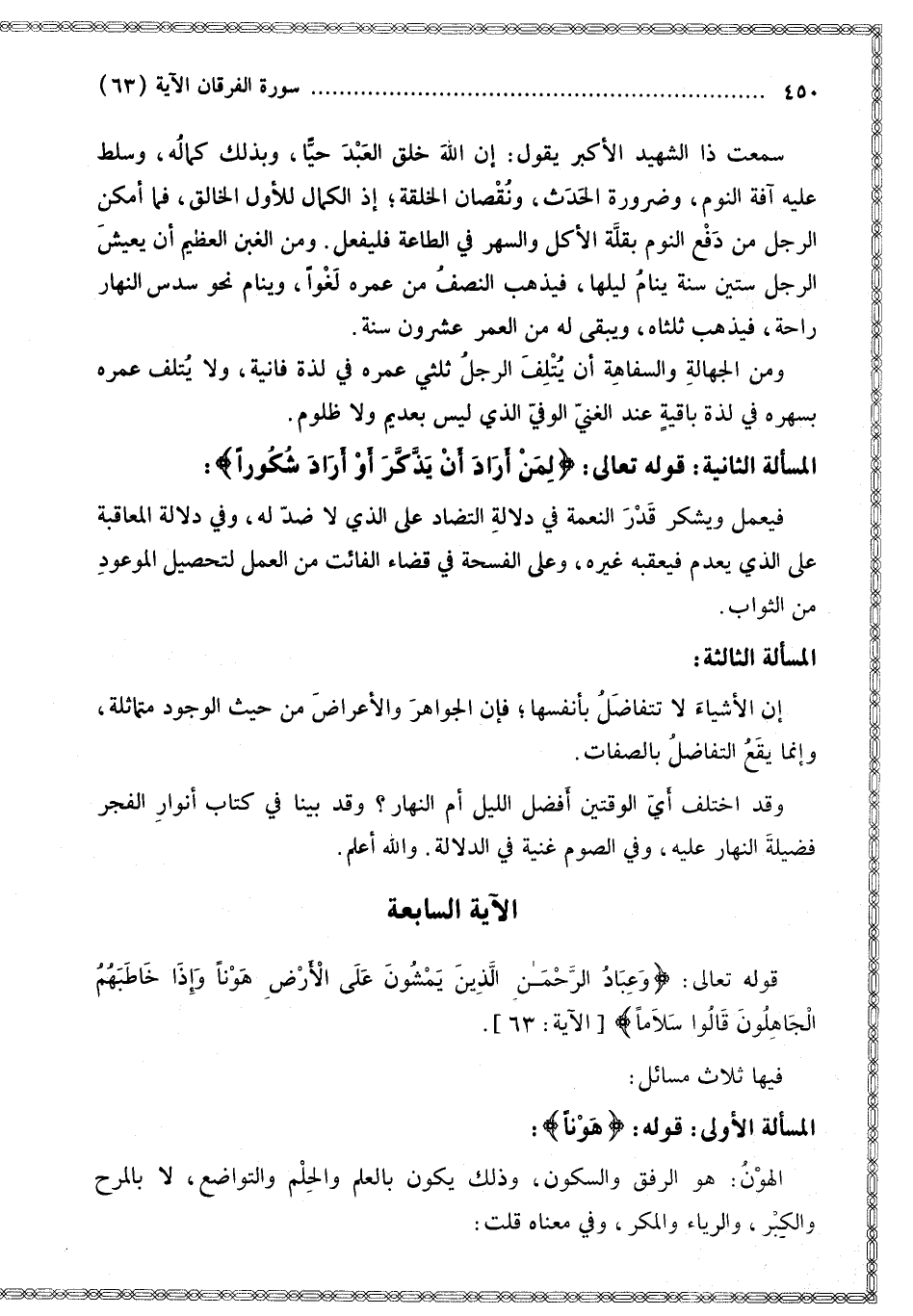 فِيهَا ثَلَاثُ مَسَائِلَ: الْمَسْأَلَةُ الْأُولَى: قَوْلُهُ: {هَوْنًا} [الفرقان: 63] الْهَوْنُ: هُوَ الرِّفْقُ وَالسُّكُونُ، وَذَلِكَ يَكُونُ بِالْعِلْمِ وَالْحِلْمِ وَالتَّوَاضُعِ، لَا بِالْمَرِحِ وَالْكِبْرِ، وَالرِّيَاءِ وَالْمَكْرِ، وَفِي مَعْنَاهُ قُلْت: