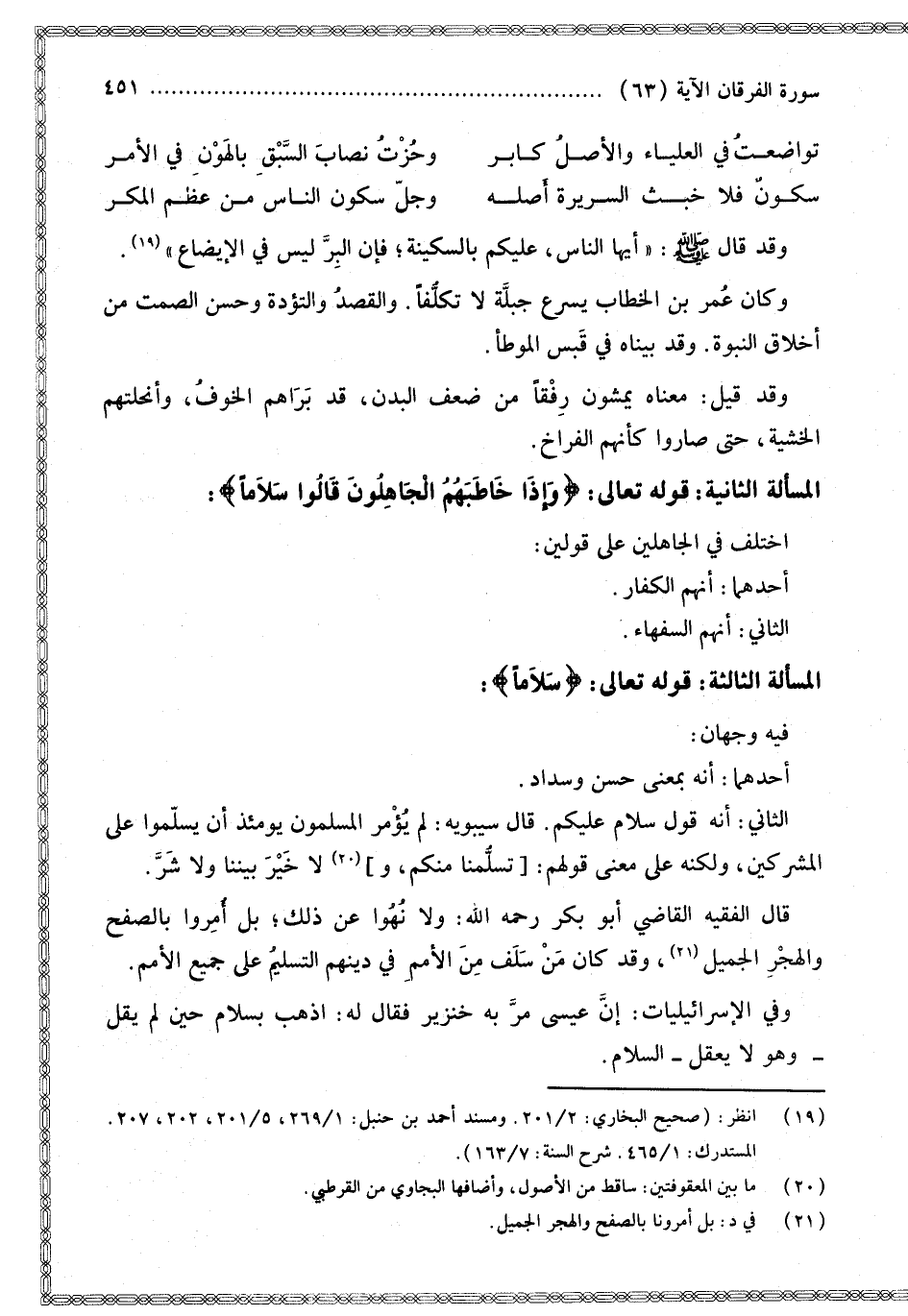 الثَّانِي: أَنَّهُمْ السُّفَهَاءُ. الْمَسْأَلَةُ الثَّالِثَةُ: قَوْله تَعَالَى: {سَلامًا} [الفرقان: 63]