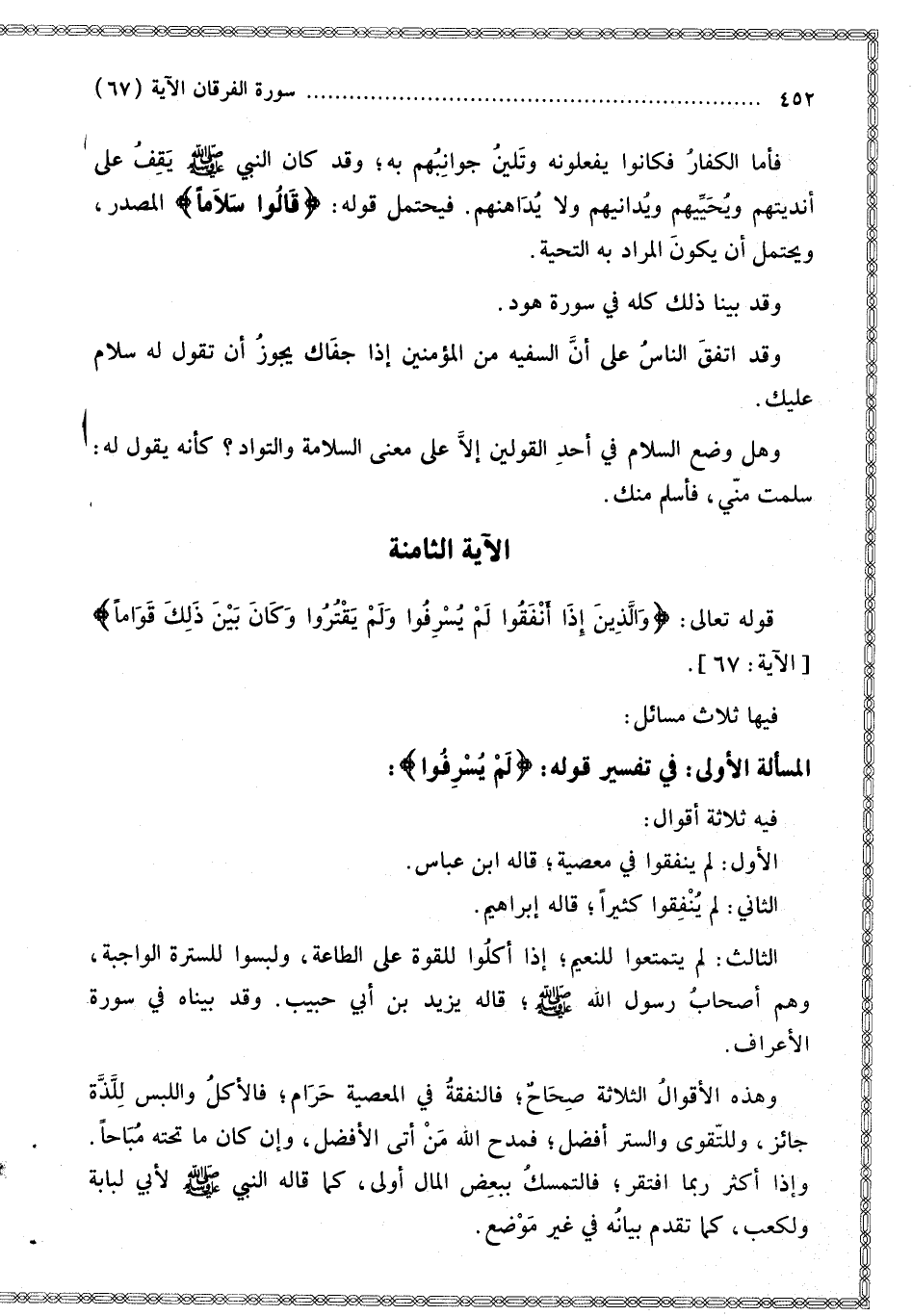 فِيهَا ثَلَاثُ مَسَائِلَ: الْمَسْأَلَةُ الْأُولَى: فِي تَفْسِيرِ قَوْلِهِ: {لَمْ يُسْرِفُوا} [الفرقان: 67] فِيهِ ثَلَاثَةُ أَقْوَالٍ: الْأَوَّلُ: لَمْ يُنْفِقُوا فِي مَعْصِيَةٍ قَالَهُ ابْنُ عَبَّاسٍ.