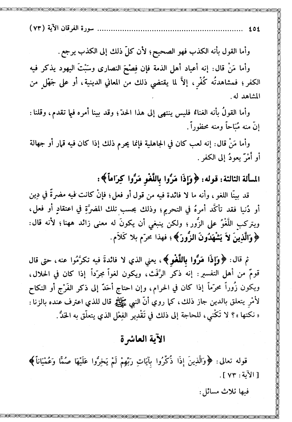 قَدْ بَيَّنَّا اللَّغْوَ، وَأَنَّهُ مَا لَا فَائِدَةَ فِيهِ مِنْ قَوْلٍ أَوْ فِعْلٍ؛ فَإِنْ كَانَتْ فِيهِ مَضَرَّةٌ فِي دِينٍ أَوْ دُنْيَا فَقَدْ تَأَكَّدَ أَمْرُهُ فِي التَّحْرِيمِ؛ وَذَلِكَ بِحَسْبِ تِلْكَ الْمَضَرَّةِ فِي اعْتِقَادٍ أَوْ فِعْلٍ، وَيَتَرَكَّبُ اللَّغْوُ عَلَى الزُّورِ؛ وَلَكِنْ يَنْبَغِي أَنْ يَكُونَ لَهُ مَعْنَى زَائِدٌ هَاهُنَا؛ لِأَنَّهُ قَالَ: {وَالَّذِينَ لا يَشْهَدُونَ الزُّورَ} [الفرقان: 72] فَهَذَا مُحَرَّمٌ بِلَا كَلَامٍ.