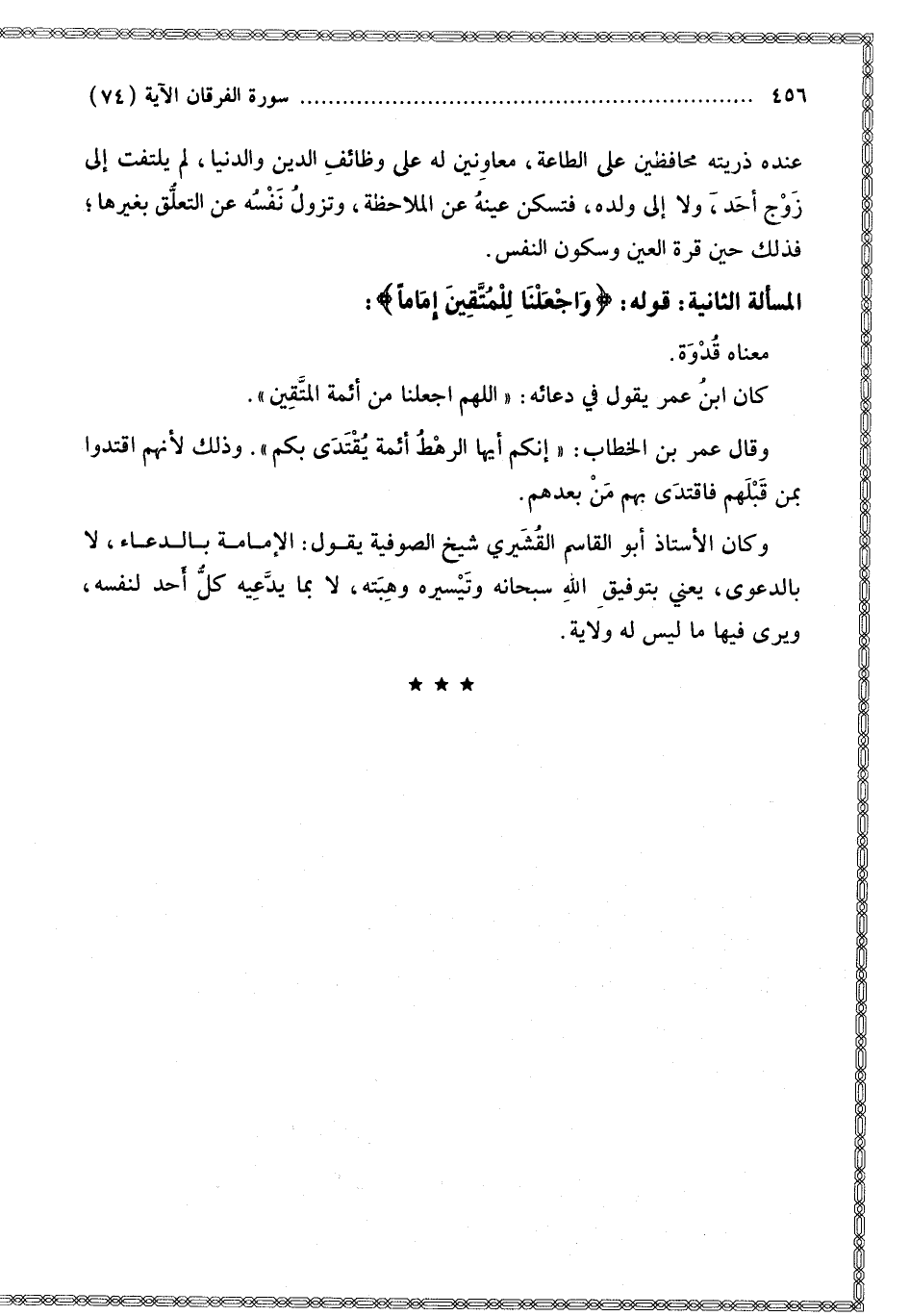 عِنْدَهُ ذُرِّيَّتُهُ مُحَافِظِينَ عَلَى الطَّاعَةِ، مُعَاوِنِينَ لَهُ عَلَى وَظَائِفِ الدِّينِ وَالدُّنْيَا، لَمْ يَلْتَفِتْ إلَى زَوْجِ أَحَدٍ، وَلَا إلَى وَلَدِهِ، فَتَسْكُنُ عَيْنُهُ عَنْ الْمُلَاحَظَةِ، وَتَزُولُ نَفْسُهُ عَنْ التَّعَلُّقِ بِغَيْرِهَا؛ فَذَلِكَ حِينَ قُرَّةِ الْعَيْنِ وَسُكُونِ النَّفْسِ. الْمَسْأَلَةُ الثَّانِيَةُ: قَوْلُهُ {وَاجْعَلْنَا لِلْمُتَّقِينَ إِمَامًا} [الفرقان: 74]