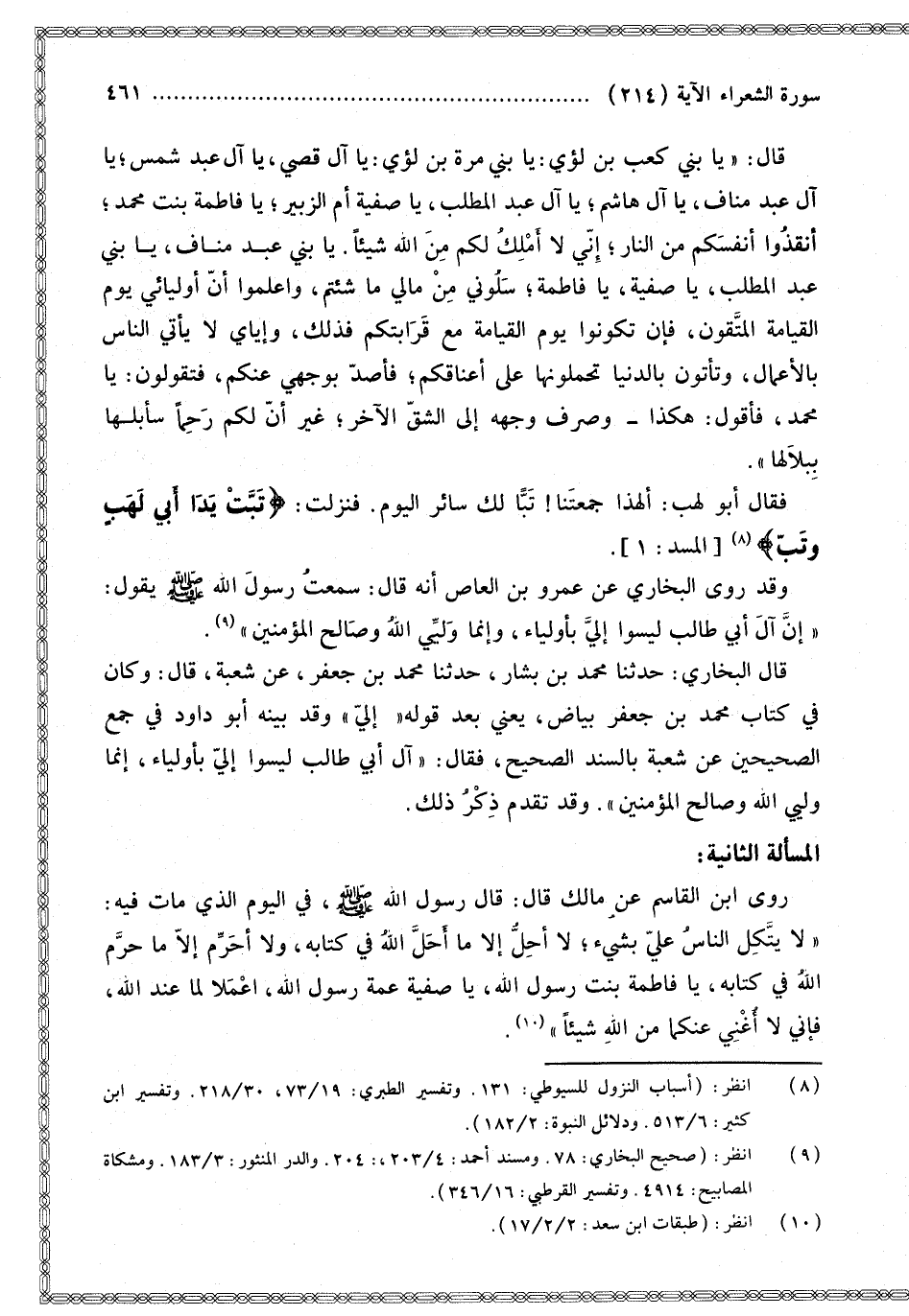 قَالَ: «يَا بَنِي كَعْبِ بْنِ لُؤَيٍّ: يَا بَنِي مُرَّةَ بْنِ لُؤَيٍّ: يَا آلَ قُصَيٍّ، يَا آلَ عَبْدِ شَمْسٍ؛ يَا آلَ عَبْدِ مَنَافٍ، يَا آلَ هَاشِمٍ؛ يَا آلَ عَبْدِ الْمُطَّلِبِ، يَا صَفِيَّةُ أُمَّ الزُّبَيْرِ؛ يَا فَاطِمَةُ بِنْتَ مُحَمَّدٍ؛ أَنْقِذُوا أَنْفُسَكُمْ مِنْ النَّارِ؛ إنِّي لَا أَمْلِكُ لَكُمْ مِنْ اللَّهِ شَيْئًا. يَا بَنِي عَبْدِ مَنَافٍ، يَا بَنِي عَبْدِ الْمُطَّلِبِ، يَا صَفِيَّةُ، يَا فَاطِمَةُ؛ سَلُونِي مِنْ مَالِي مَا شِئْتُمْ، وَاعْلَمُوا أَنَّ أَوْلِيَائِي يَوْمَ الْقِيَامَةِ الْمُتَّقُونَ، فَإِنْ تَكُونُوا يَوْمَ الْقِيَامَةِ مَعَ قَرَابَتِكُمْ فَذَلِكَ، وَإِيَّايَ لَا يَأْتِي النَّاسُ بِالْأَعْمَالِ، وَتَأْتُونَ بِالدُّنْيَا تَحْمِلُونَهَا عَلَى أَعْنَاقِكُمْ؛ فَأَصُدُّ بِوَجْهِي عَنْكُمْ، فَتَقُولُونَ: يَا مُحَمَّدُ، فَأَقُولُ: هَكَذَا وَصَرَفَ وَجْهَهُ إلَى الشِّقِّ الْآخَرِ؛ غَيْرَ أَنَّ لَكُمْ رَحِمًا سَأَبُلُّهَا بِبِلَالِهَا».