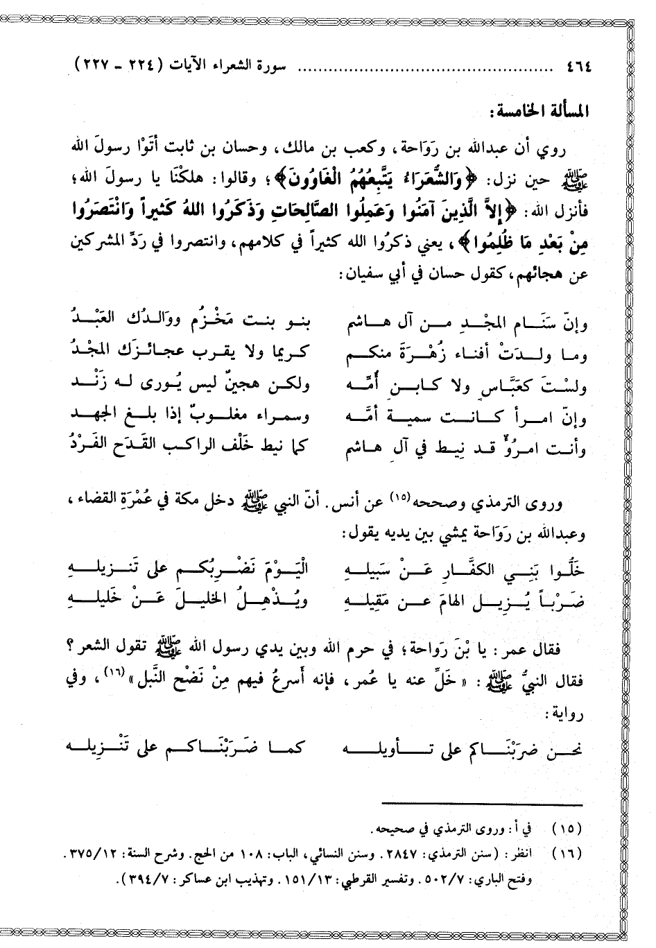 الْمَسْأَلَةُ الْخَامِسَةُ: رُوِيَ أَنَّ «عَبْدَ اللَّهِ بْنَ رَوَاحَةَ، وَكَعْبَ بْنَ مَالِكٍ، وَحَسَّانَ بْنَ ثَابِتٍ أَتَوْا رَسُولَ اللَّهِ - صَلَّى اللَّهُ عَلَيْهِ وَسَلَّمَ - حِينَ نَزَلَ: {وَالشُّعَرَاءُ يَتَّبِعُهُمُ الْغَاوُونَ} [الشعراء: 224] وَقَالُوا: هَلَكْنَا يَا رَسُولَ اللَّهِ؛ فَأَنْزَلَ اللَّهُ: {إِلا الَّذِينَ آمَنُوا وَعَمِلُوا الصَّالِحَاتِ وَذَكَرُوا اللَّهَ كَثِيرًا وَانْتَصَرُوا مِنْ بَعْدِ مَا ظُلِمُوا} [الشعراء: 227] يَعْنِي ذَكَرُوا اللَّهَ كَثِيرًا فِي كَلَامِهِمْ، وَانْتَصَرُوا فِي رَدِّ الْمُشْرِكِينَ عَنْ هِجَائِهِمْ».
