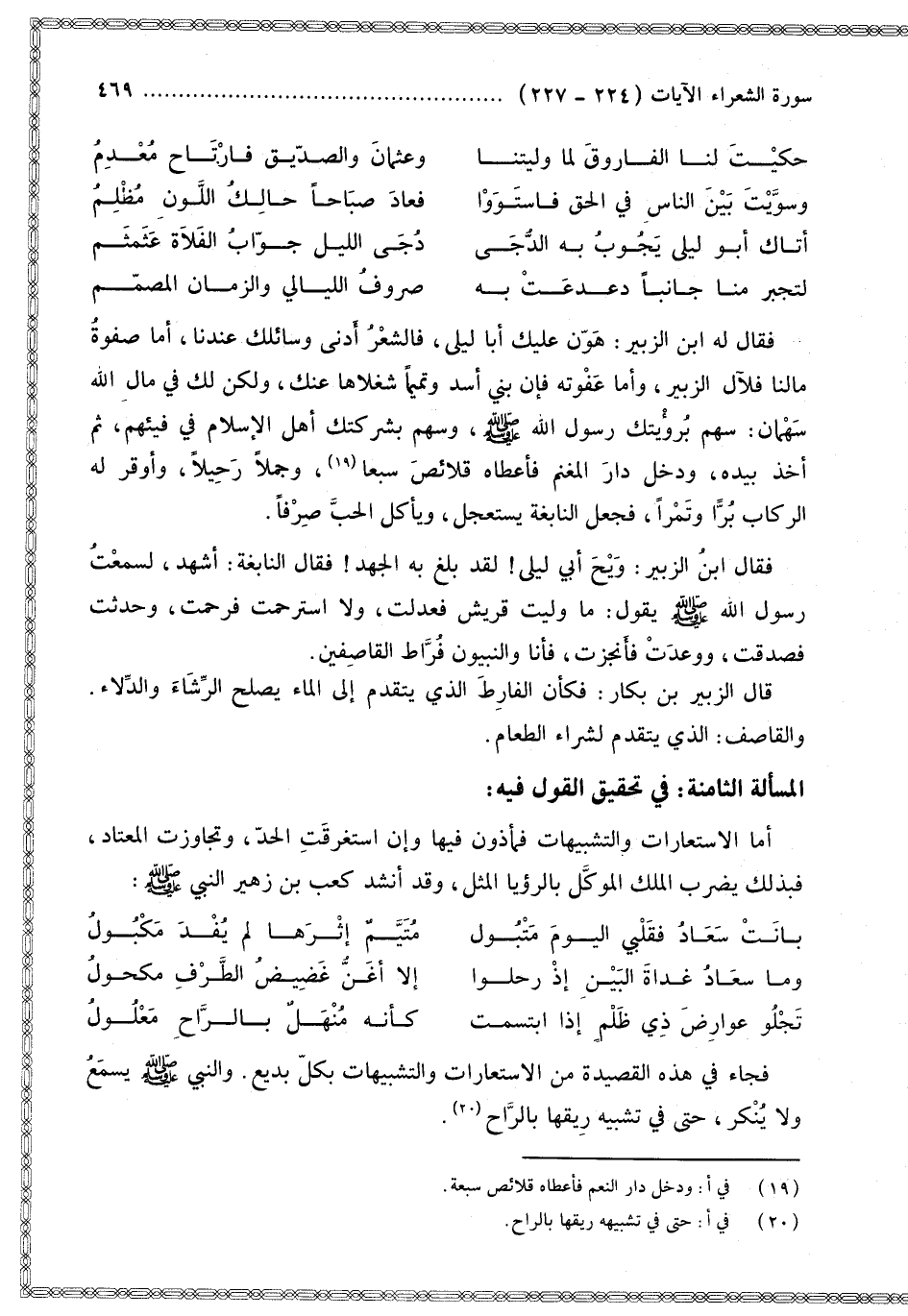 فَقَالَ لَهُ ابْنُ الزُّبَيْرِ: هَوِّنْ عَلَيْك أَبَا لَيْلَى، فَالشِّعْرُ أَدْنَى وَسَائِلُكَ عِنْدَنَا، أَمَّا صَفْوَةُ مَالِنَا فَلِآلِ الزُّبَيْرِ، وَأَمَّا عَفْوَتُهُ فَإِنَّ بَنِي أَسَدٍ وَتَمِيمًا شَغَلَاهَا عَنْك، وَلَكِنْ لَك فِي مَالِ اللَّهِ سَهْمَانِ: سَهْمٌ بِرُؤْيَتِك رَسُولَ اللَّهِ - صَلَّى اللَّهُ عَلَيْهِ وَسَلَّمَ - وَسَهْمٌ بِشَرِكَتِك أَهْلَ الْإِسْلَامِ فِي فَيْئِهِمْ، ثُمَّ أَخَذَ بِيَدِهِ، وَدَخَلَ دَارَ الْمَغْنَمِ فَأَعْطَاهُ قَلَائِصَ سَبْعًا، وَجَمَلًا رَحِيلًا، وَأَوْقَرَ لَهُ الرِّكَابَ بُرًّا وَتَمْرًا، فَجَعَلَ النَّابِغَةُ يَسْتَعْجِلُ، وَيَأْكُلُ الْحَبَّ صِرْفًا. فَقَالَ ابْنُ الزُّبَيْرِ: وَيْحَ أَبِي لَيْلَى، لَقَدْ بَلَغَ بِهِ الْجَهْدُ، فَقَالَ النَّابِغَةُ: أَشْهَدُ، لَسَمِعْت رَسُولَ اللَّهِ - صَلَّى اللَّهُ عَلَيْهِ وَسَلَّمَ - يَقُولُ: «مَا وَلِيَتْ؟؟ قُرَيْشٌ فَعَدَلَتْ، وَلَا اُسْتُرْحِمَتْ فَرُحِمَتْ، وَحَدَّثَتْ فَصَدَقَتْ، وَوَعَدَتْ فَأَنْجَزَتْ، فَأَنَا وَالنَّبِيُّونَ فُرَّاطُ الْقَاصِفِينَ». قَالَ الزُّبَيْرُ بْنُ بَكَّارٍ: فَكَأَنَّ الْفَارِطَ الَّذِي يَتَقَدَّمُ إلَى الْمَاءِ يُصْلِحُ الرِّشَاءَ وَالدِّلَاءَ. وَالْقَاصِفُ: الَّذِي يَتَقَدَّمُ لِشِرَاءِ الطَّعَامِ