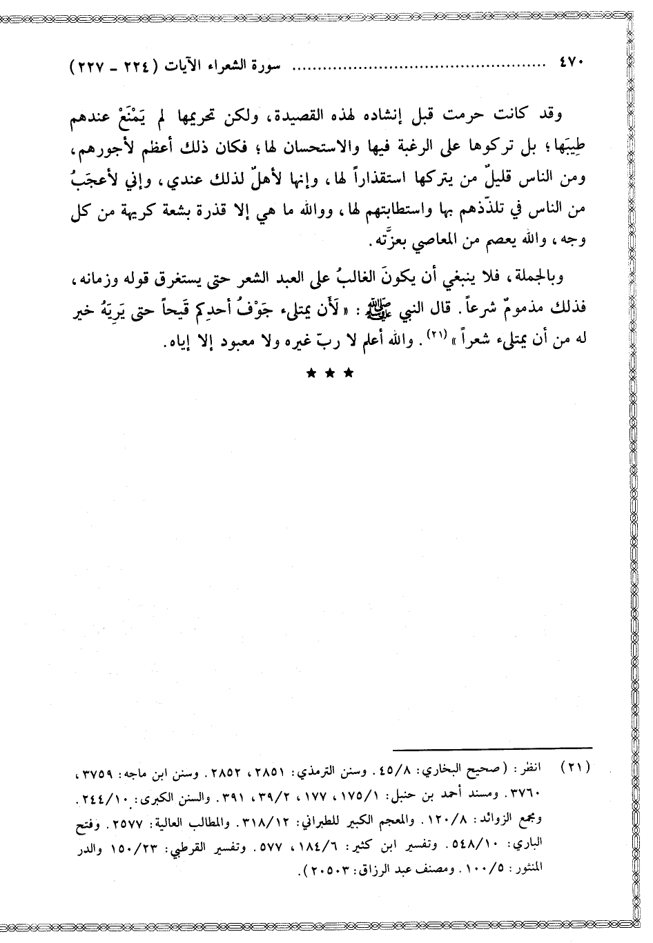 وَبِالْجُمْلَةِ، فَلَا يَنْبَغِي أَنْ يَكُونَ الْغَالِبُ عَلَى الْعَبْدِ الشِّعْرُ حَتَّى يَسْتَغْرِقَ قَوْلَهُ وَزَمَانَهُ، فَذَلِكَ مَذْمُومٌ شَرْعًا. قَالَ النَّبِيُّ - صَلَّى اللَّهُ عَلَيْهِ وَسَلَّمَ -: «لَأَنْ يَمْتَلِئَ جَوْفُ أَحَدِكُمْ قَيْحًا حَتَّى يَرِيَهُ خَيْرٌ لَهُ مِنْ أَنْ يَمْتَلِئَ شِعْرًا». وَاَللَّهُ أَعْلَمُ لَا رَبَّ غَيْرُهُ وَلَا مَعْبُودَ إلَّا إيَّاهُ.