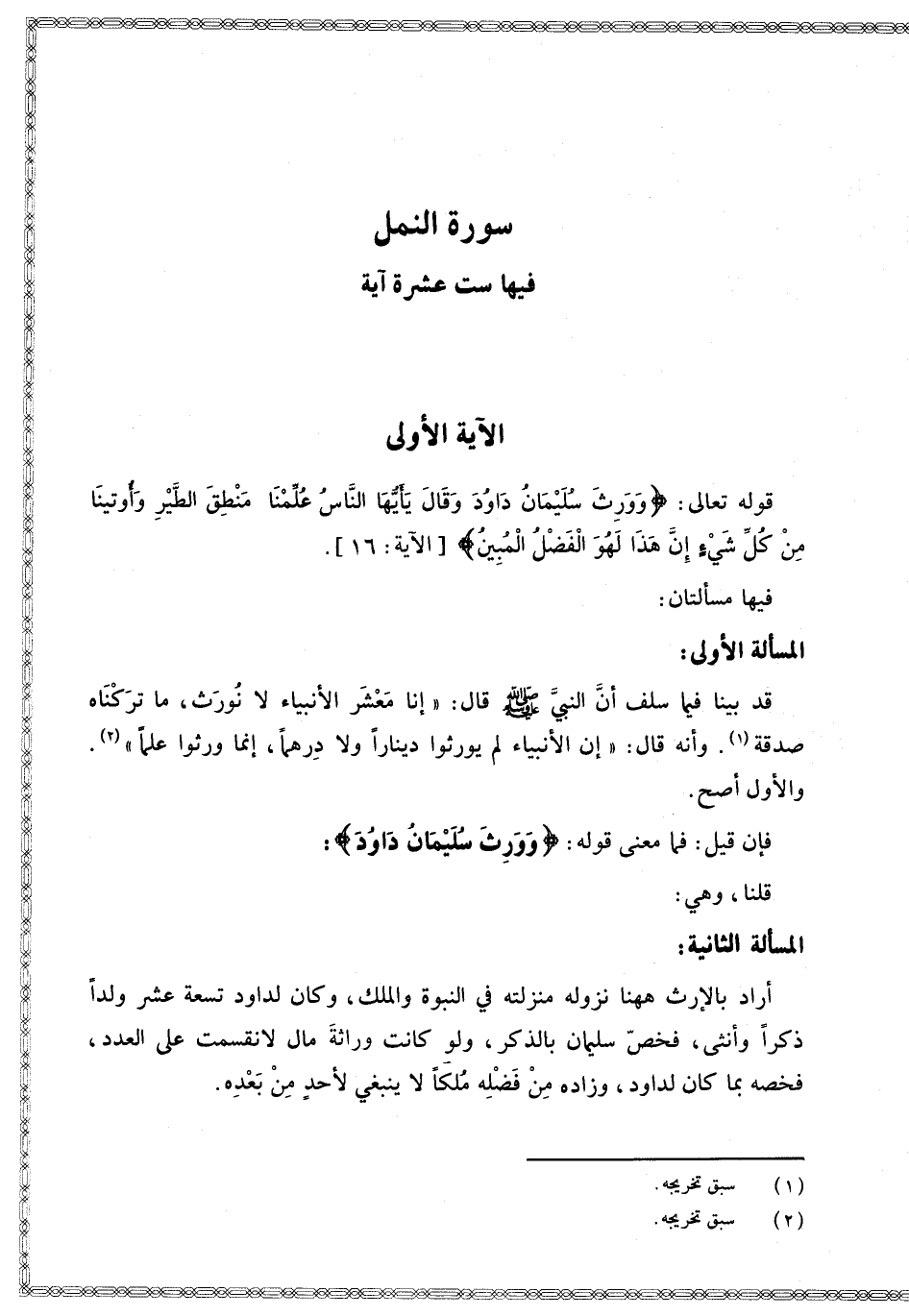 فِيهَا مَسْأَلَتَانِ: الْمَسْأَلَةُ الْأُولَى: قَدْ بَيَّنَّا فِيمَا سَلَفَ أَنَّ النَّبِيَّ - صَلَّى اللَّهُ عَلَيْهِ وَسَلَّمَ - قَالَ: «إنَّا مَعْشَرَ الْأَنْبِيَاءِ لَا نُورَثُ، مَا تَرَكْنَاهُ صَدَقَةٌ». وَأَنَّهُ قَالَ: «إنَّ الْأَنْبِيَاءَ لَمْ يُوَرِّثُوا دِينَارًا وَلَا دِرْهَمًا، إنَّمَا وَرَّثُوا عِلْمًا». وَالْأَوَّلُ أَصَحُّ.