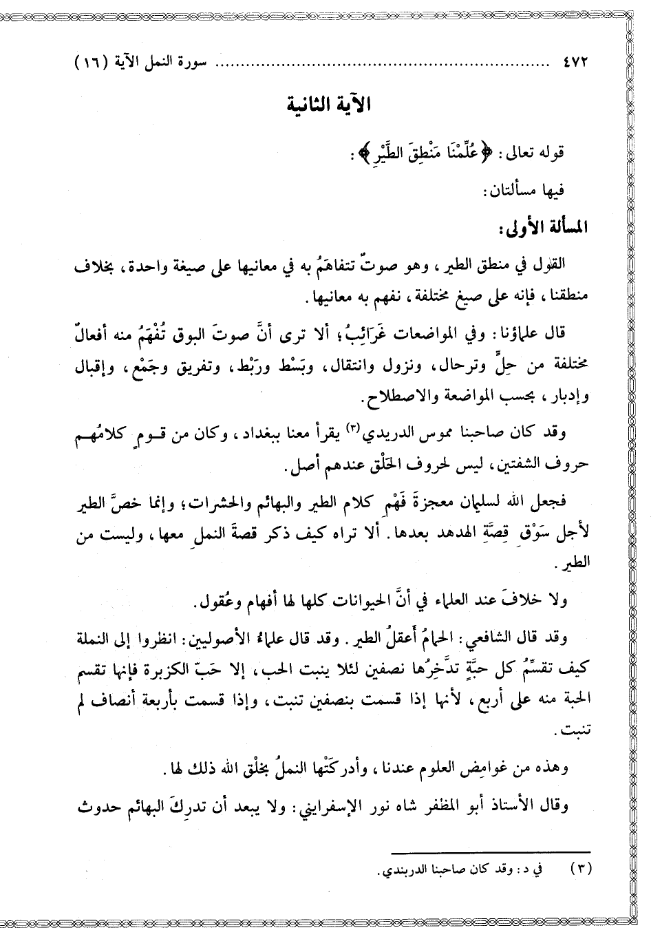 ِ} [النمل: 16]: فِيهَا مَسْأَلَتَانِ: الْمَسْأَلَةُ الْأُولَى: الْقَوْلُ فِي مَنْطِقِ الطَّيْرِ، وَهُوَ صَوْتٌ تَتَفَاهَمُ بِهِ فِي مَعَانِيهَا عَلَى صِيغَةٍ وَاحِدَةٍ، بِخِلَافِ مَنْطِقِنَا، فَإِنَّهُ عَلَى صِيَغٍ مُخْتَلِفَةٍ، نَفْهَمُ بِهِ مَعَانِيَهَا.