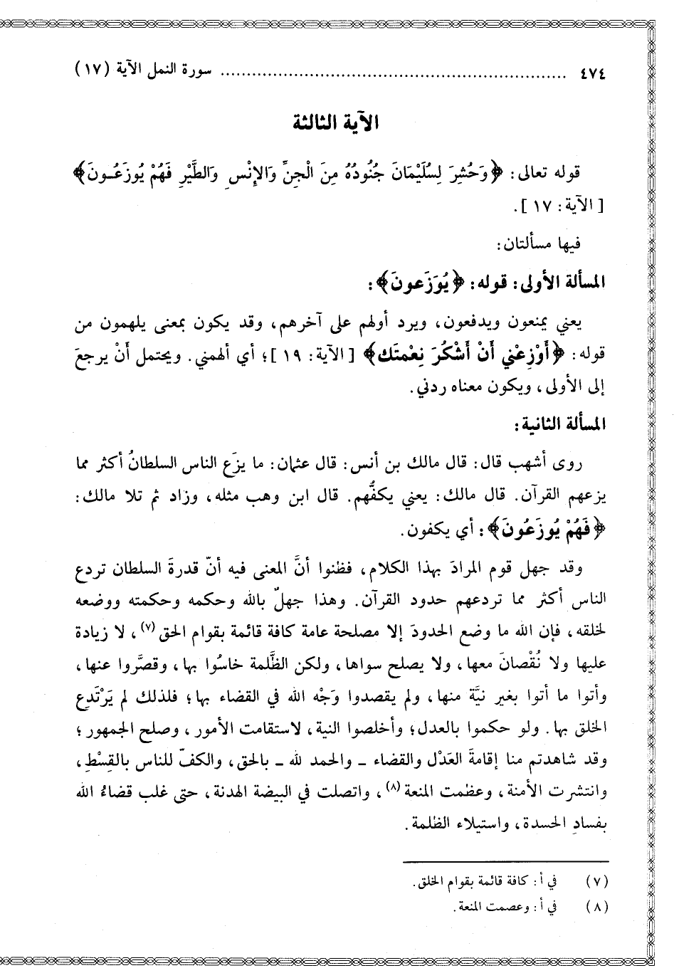 فِيهَا مَسْأَلَتَانِ: الْمَسْأَلَةُ الْأُولَى: قَوْلُهُ: {يُوزَعُونَ} [النمل: 17] يَعْنِي يَمْنَعُونَ وَيَدْفَعُونَ، وَيَرُدُّ أَوَّلُهُمْ عَلَى آخِرِهِمْ، وَقَدْ يَكُونُ بِمَعْنَى يُلْهَمُونَ مِنْ قَوْلِهِ: {أَوْزِعْنِي أَنْ أَشْكُرَ نِعْمَتَكَ} [النمل: 19] أَيْ أَلْهِمْنِي. وَيُحْتَمَلُ أَنْ يَرْجِعَ إلَى الْأُولَى، وَيَكُونُ مَعْنَاهُ رُدَّنِي.