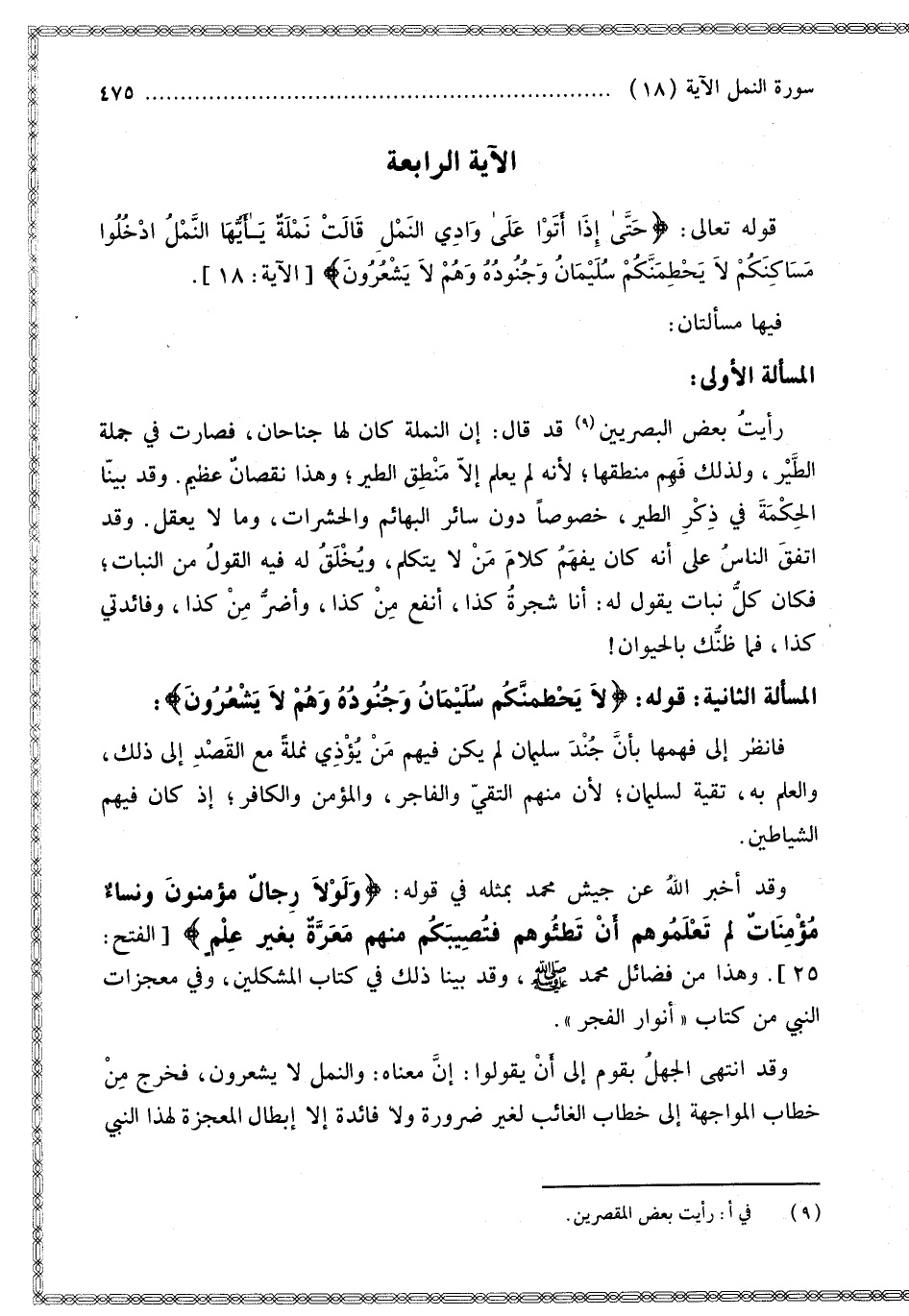 فِيهَا مَسْأَلَتَانِ: الْمَسْأَلَةُ الْأُولَى: رَأَيْت بَعْضَ الْبَصْرِيِّينَ قَدْ قَالَ: إنَّ النَّمْلَةَ كَانَ لَهَا جَنَاحَانِ، فَصَارَتْ فِي جُمْلَةِ الطَّيْرِ، وَلِذَلِكَ فَهِمَ مَنْطِقَهَا؛ لِأَنَّهُ لَمْ يَعْلَمْ إلَّا مَنْطِقَ الطَّيْرِ؛ وَهَذَا نُقْصَانٌ عَظِيمٌ. وَقَدْ بَيَّنَّا الْحِكْمَةَ فِي ذِكْرِ الطَّيْرِ خُصُوصًا دُونَ سَائِرِ الْبَهَائِمِ وَالْحَشَرَاتِ، وَمَا لَا يَعْقِلُ.
