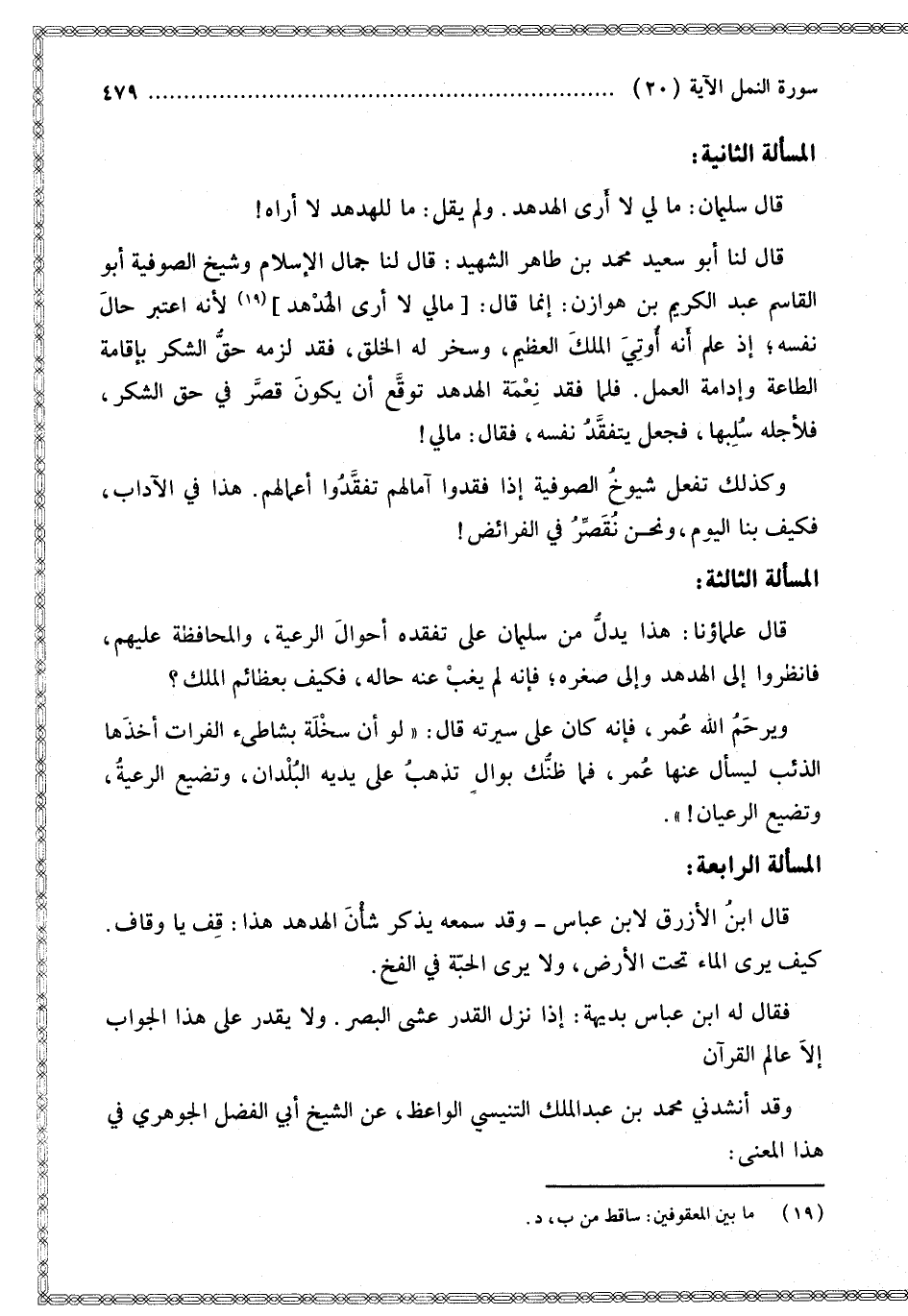 الْمَسْأَلَةُ الثَّانِيَةُ: قَالَ سُلَيْمَانُ: مَا لِي لَا أَرَى الْهُدْهُدَ. وَلَمْ يَقُلْ: مَا لِلْهُدْهُدِ لَا أَرَاهُ، قَالَ لَنَا أَبُو سَعِيدٍ مُحَمَّدُ بْنُ طَاهِرٍ الشَّهِيدُ: قَالَ لَنَا جَمَالُ الْإِسْلَامِ وَشَيْخُ الصُّوفِيَّةِ أَبُو الْقَاسِمِ عَبْدُ الْكَرِيمِ بْنُ هَوَازِنَ: إنَّمَا قَالَ: [مَالِي لَا أَرَى الْهُدْهُدَ]؛ لِأَنَّهُ اعْتَبَرَ حَالَ نَفْسِهِ؟ إذْ عَلِمَ أَنَّهُ أُوتِيَ الْمُلْكَ الْعَظِيمَ، وَسُخِّرَ لَهُ الْخَلْقُ، فَقَدْ لَزِمَهُ حَقُّ الشُّكْرِ بِإِقَامَةِ الطَّاعَةِ وَإِدَامَةِ الْعَمَلِ. فَلَمَّا فَقَدَ نِعْمَةَ الْهُدْهُدِ تَوَقَّعَ أَنْ يَكُونَ قَصَّرَ فِي حَقِّ الشُّكْرِ، فَلِأَجْلِهِ سُلِبَهَا، فَجَعَلَ يَتَفَقَّدُ نَفْسَهُ، فَقَالَ: مَالِي، وَكَذَلِكَ تَفْعَلُ شُيُوخُ الصُّوفِيَّةِ إذَا فَقَدُوا آمَالَهُمْ تَفَقَّدُوا أَعْمَالَهُمْ. هَذَا فِي الْآدَابِ، فَكَيْفَ بِنَا الْيَوْمَ، وَنَحْنُ نُقَصِّرُ فِي الْفَرَائِضِ، الْمَسْأَلَةُ الثَّالِثَةُ: قَالَ عُلَمَاؤُنَا: هَذَا يَدُلُّ مِنْ سَلِيمَانِ عَلَى تَفَقُّدِهِ أَحْوَالَ الرَّعِيَّةِ، وَالْمُحَافَظَةِ عَلَيْهِمْ، فَانْظُرُوا إلَى الْهُدْهُدِ وَإِلَى صِغَرِهِ فَإِنَّهُ لَمْ يَغِبْ عَنْهُ حَالُهُ، فَكَيْفَ بِعَظَائِمِ الْمُلْكِ؟ وَيَرْحَمُ اللَّهُ عُمَرَ، فَإِنَّهُ كَانَ عَلَى سِيرَتِهِ قَالَ: " لَوْ أَنَّ سَخْلَةً بِشَاطِئِ الْفُرَاتِ أَخَذَهَا الذِّئْبُ لَيُسْأَلُ عَنْهَا عُمَرُ، فَمَا ظَنُّك بِوَالٍ تَذْهَبُ عَلَى يَدَيْهِ الْبُلْدَانُ، وَتَضِيعُ الرَّعِيَّةُ، وَتَضِيعُ الرُّعْيَانُ،