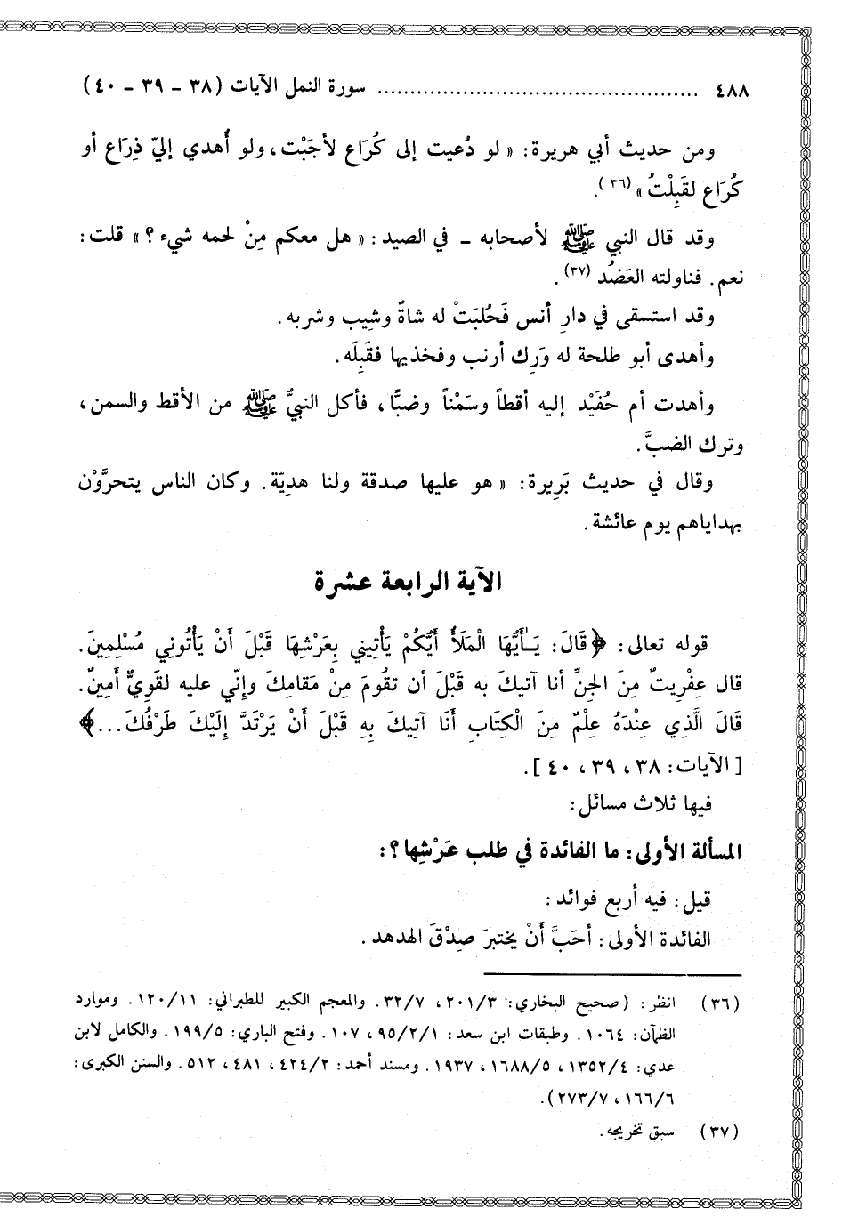 الْآيَةُ الرَّابِعَةَ عَشْرَةَ قَوْله تَعَالَى: {قَالَ يَا أَيُّهَا الْمَلأُ أَيُّكُمْ يَأْتِينِي بِعَرْشِهَا قَبْلَ أَنْ يَأْتُونِي مُسْلِمِينَ - قَالَ عِفْرِيتٌ مِنَ الْجِنِّ أَنَا آتِيكَ بِهِ قَبْلَ أَنْ تَقُومَ مِنْ مَقَامِكَ وَإِنِّي عَلَيْهِ لَقَوِيٌّ أَمِينٌ} [النمل: 38 - 39] {قَالَ الَّذِي عِنْدَهُ عِلْمٌ مِنَ الْكِتَابِ أَنَا آتِيكَ بِهِ قَبْلَ أَنْ يَرْتَدَّ إِلَيْكَ طَرْفُكَ} [النمل: 40].