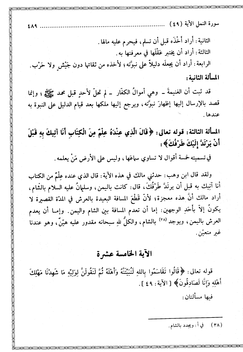 وَلَقَدْ قَالَ ابْنُ وَهْبٍ: حَدَّثَنِي مَالِكٌ فِي هَذِهِ الْآيَةِ: {قَالَ الَّذِي عِنْدَهُ عِلْمٌ مِنَ الْكِتَابِ أَنَا آتِيكَ بِهِ قَبْلَ أَنْ يَرْتَدَّ إِلَيْكَ طَرْفُكَ} [النمل: 40] قَالَ: كَانَتْ بِالْيَمَنِ، وَسُلَيْمَانُ - عَلَيْهِ السَّلَامُ - بِالشَّامِ، أَرَادَ مَالِكٌ أَنَّ هَذِهِ مُعْجِزَةٌ؛ لِأَنَّ قَطْعَ الْمَسَافَةِ الْبَعِيدَةِ بِالْعَرْشِ فِي الْمُدَّةِ الْقَصِيرَةِ لَا يَكُونُ إلَّا بِأَحَدِ الْوَجْهَيْنِ: إمَّا أَنْ تُعْدَمَ الْمَسَافَةُ بَيْنَ الشَّامِ وَالْيَمَنِ. وَإِمَّا أَنْ يُعْدَمَ الْعَرْشُ بِالْيَمَنِ، وَيُوجَدُ بِالشَّامِ، وَالْكُلُّ لِلَّهِ سُبْحَانَهُ مَقْدُورٌ عَلَيْهِ هَيِّنٌ، وَهُوَ عِنْدَنَا غَيْرُ مُتَعَيِّنٍ.