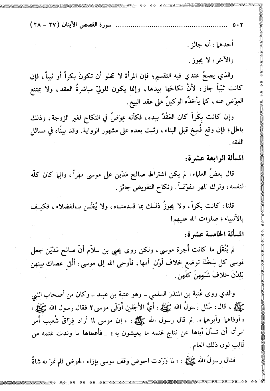 قَالَ بَعْضُ الْعُلَمَاءِ: لَمْ يَكُنْ اشْتِرَاطُ صَالِحِ مَدْيَنَ عَلَى مُوسَى مَهْرًا، وَإِنَّمَا كَانَ كُلَّهُ لِنَفْسِهِ، وَتَرَكَ الْمَهْرَ مُفَوَّضًا. وَنِكَاحُ التَّفْوِيضِ جَائِزٌ.