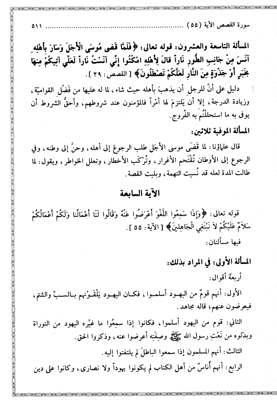 فِيهَا مَسْأَلَتَانِ: الْمَسْأَلَةُ الْأُولَى: فِي الْمُرَادِ بِذَلِكَ: أَرْبَعَةُ أَقْوَالٍ: الْأَوَّلُ: أَنَّهُمْ قَوْمٌ مِنْ الْيَهُودِ أَسْلَمُوا، فَكَانَ الْيَهُودُ يَلْقَوْنَهُمْ بِالسَّبِّ وَالشَّتْمِ، فَيُعْرِضُونَ عَنْهُمْ؛ قَالَهُ مُجَاهِدٌ.