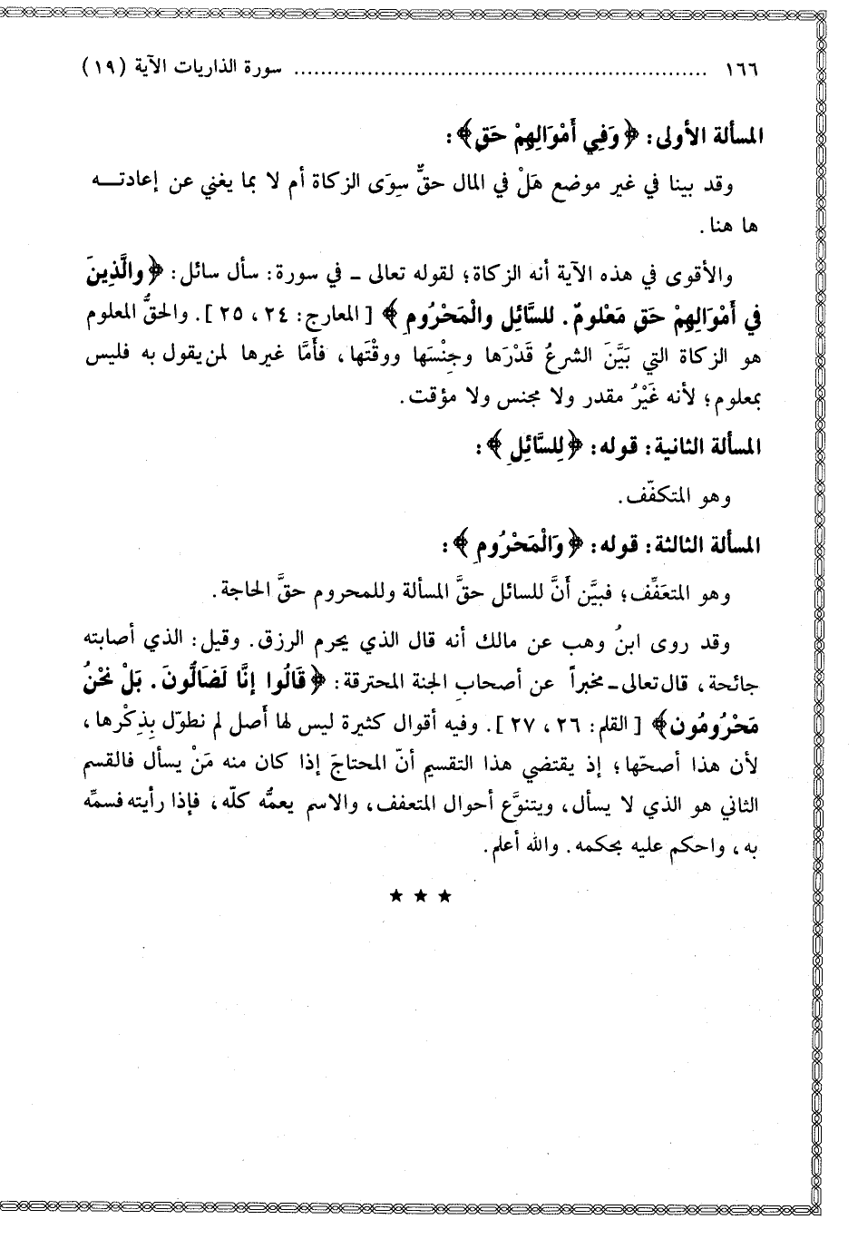 وَالْأَقْوَى فِي هَذِهِ الْآيَةِ أَنَّهُ الزَّكَاةُ؛ لِقَوْلِهِ تَعَالَى فِي سُورَةِ: سَأَلَ سَائِلٌ: {وَالَّذِينَ فِي أَمْوَالِهِمْ حَقٌّ مَعْلُومٌ} [المعارج: 24] {لِلسَّائِلِ وَالْمَحْرُومِ} [المعارج: 25] وَالْحَقُّ الْمَعْلُومُ هُوَ الزَّكَاةُ الَّتِي بَيَّنَ الشَّرْعُ قَدْرَهَا وَجِنْسَهَا وَوَقْتَهَا، فَأَمَّا غَيْرُهَا لِمَنْ يَقُولُ بِهِ فَلَيْسَ بِمَعْلُومٍ؛ لِأَنَّهُ غَيْرُ مُقَدَّرٍ وَلَا مُجَنَّسٍ وَلَا مُؤَقَّتٍ. الْمَسْأَلَةُ الثَّانِيَةُ قَوْلُهُ: {لِلسَّائِلِ} [الذاريات: 19]، وَهُوَ الْمُتَكَفِّفُ. الْمَسْأَلَةُ الثَّالِثَةُ قَوْلُهُ: {وَالْمَحْرُومِ} [الذاريات: 19]، وَهُوَ الْمُتَعَفِّفُ؛ فَبَيَّنَ أَنَّ لِلسَّائِلِ حَقَّ الْمَسْأَلَةِ وَلِلْمَحْرُومِ حَقَّ الْحَاجَةِ.