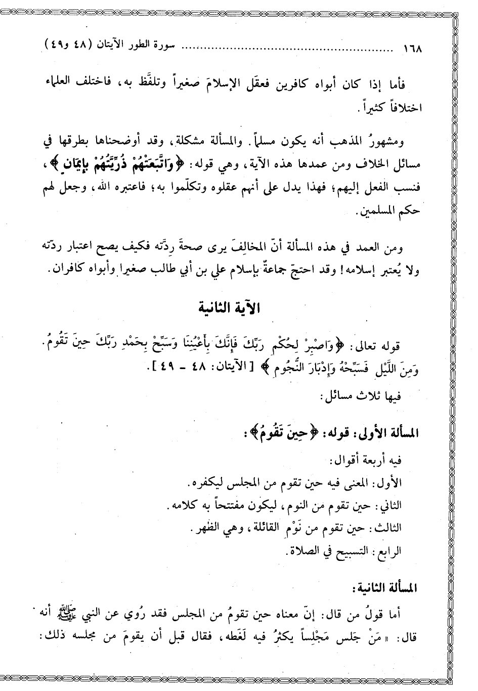 فِيهَا ثَلَاثُ مَسَائِلَ: الْمَسْأَلَةُ الْأُولَى: قَوْلُهُ: {حِينَ تَقُومُ} [الطور: 48] فِيهِ أَرْبَعَةُ أَقْوَالٍ: الْأَوَّلُ: الْمَعْنَى فِيهِ حِينَ تَقُومُ مِنْ الْمَجْلِسِ لِيُكَفِّرَهُ.