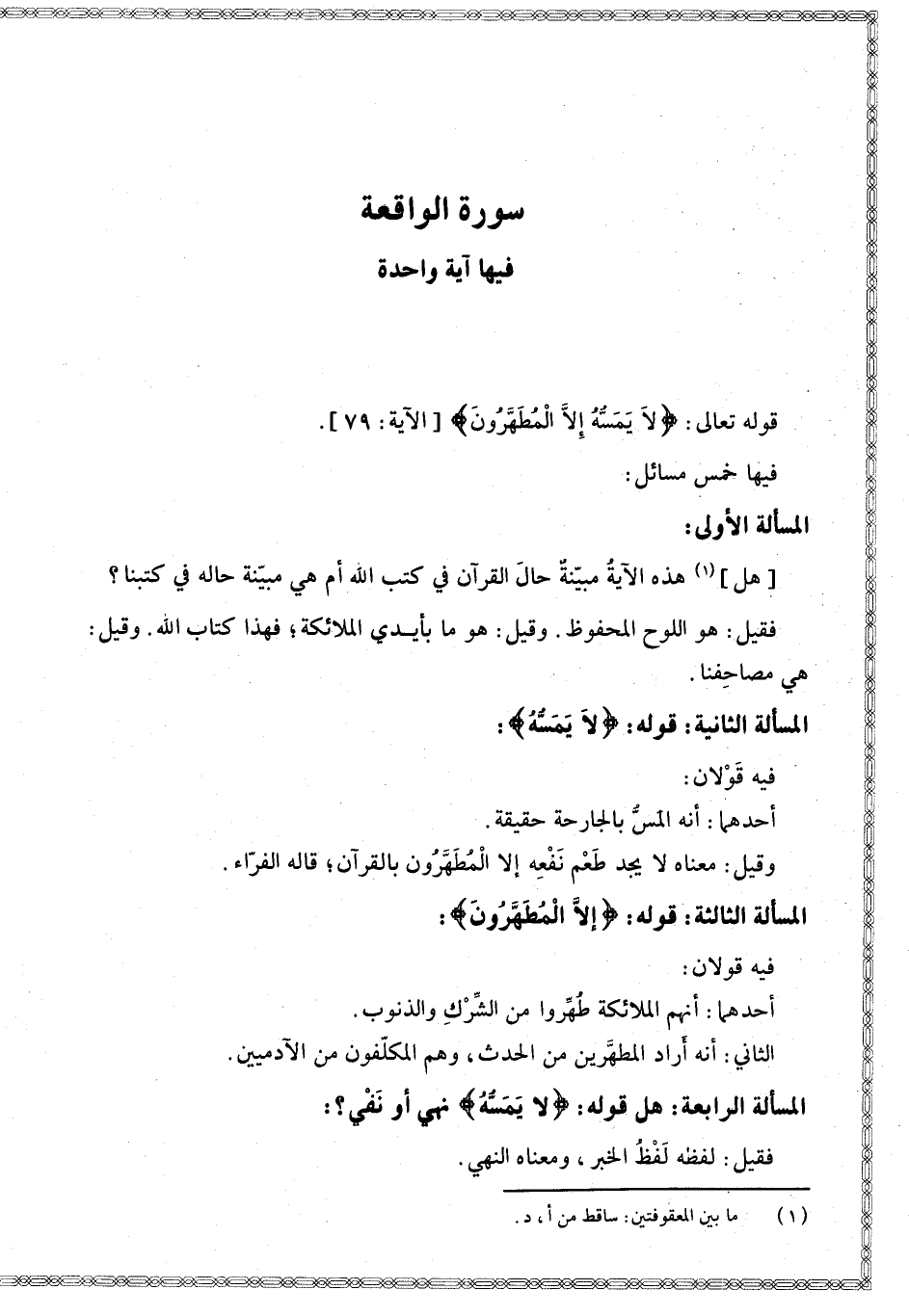 قَوْله تَعَالَى: {لا يَمَسُّهُ إِلا الْمُطَهَّرُونَ} [الواقعة: 79]. فِيهَا خَمْسُ مَسَائِلَ: الْمَسْأَلَةُ الْأُولَى [هَلْ] هَذِهِ الْآيَةُ مُبَيِّنَةٌ حَالَ الْقُرْآنِ فِي كُتُبِ اللَّهِ أَمْ هِيَ مُبَيِّنَةٌ فِي كُتُبِنَا؟ فَقِيلَ: هُوَ اللَّوْحُ الْمَحْفُوظُ. وَقِيلَ: هُوَ مَا بِأَيْدِي الْمَلَائِكَةِ؛ فَهَذَا كِتَابُ اللَّهِ. وَقِيلَ: هِيَ مَصَاحِفُنَا. الْمَسْأَلَةُ الثَّانِيَةُ قَوْلُهُ: {لا يَمَسُّهُ} [الواقعة: 79] فِيهِ قَوْلَانِ: أَحَدُهُمَا أَنَّهُ الْمَسُّ بِالْجَارِحَةِ حَقِيقَةً.