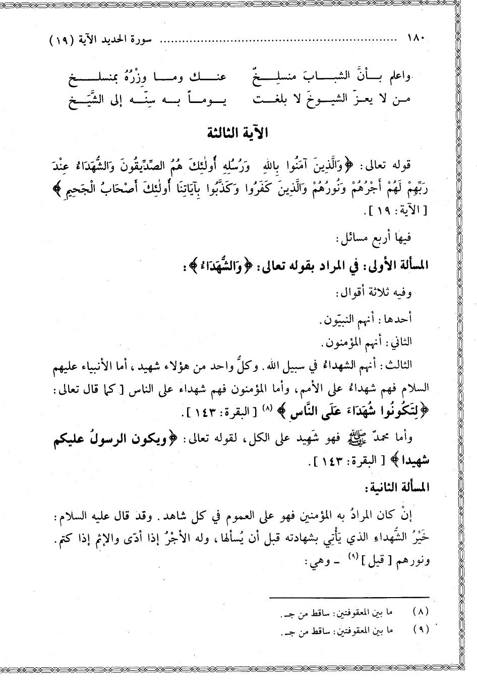 فِيهَا أَرْبَعُ مَسَائِلَ: الْمَسْأَلَةُ الْأُولَى فِي الْمُرَادِ بِقَوْلِهِ تَعَالَى: {وَالشُّهَدَاءُ} [الحديد: 19] وَفِيهِ ثَلَاثَةُ أَقْوَالٍ: أَحَدُهَا أَنَّهُمْ النَّبِيُّونَ.