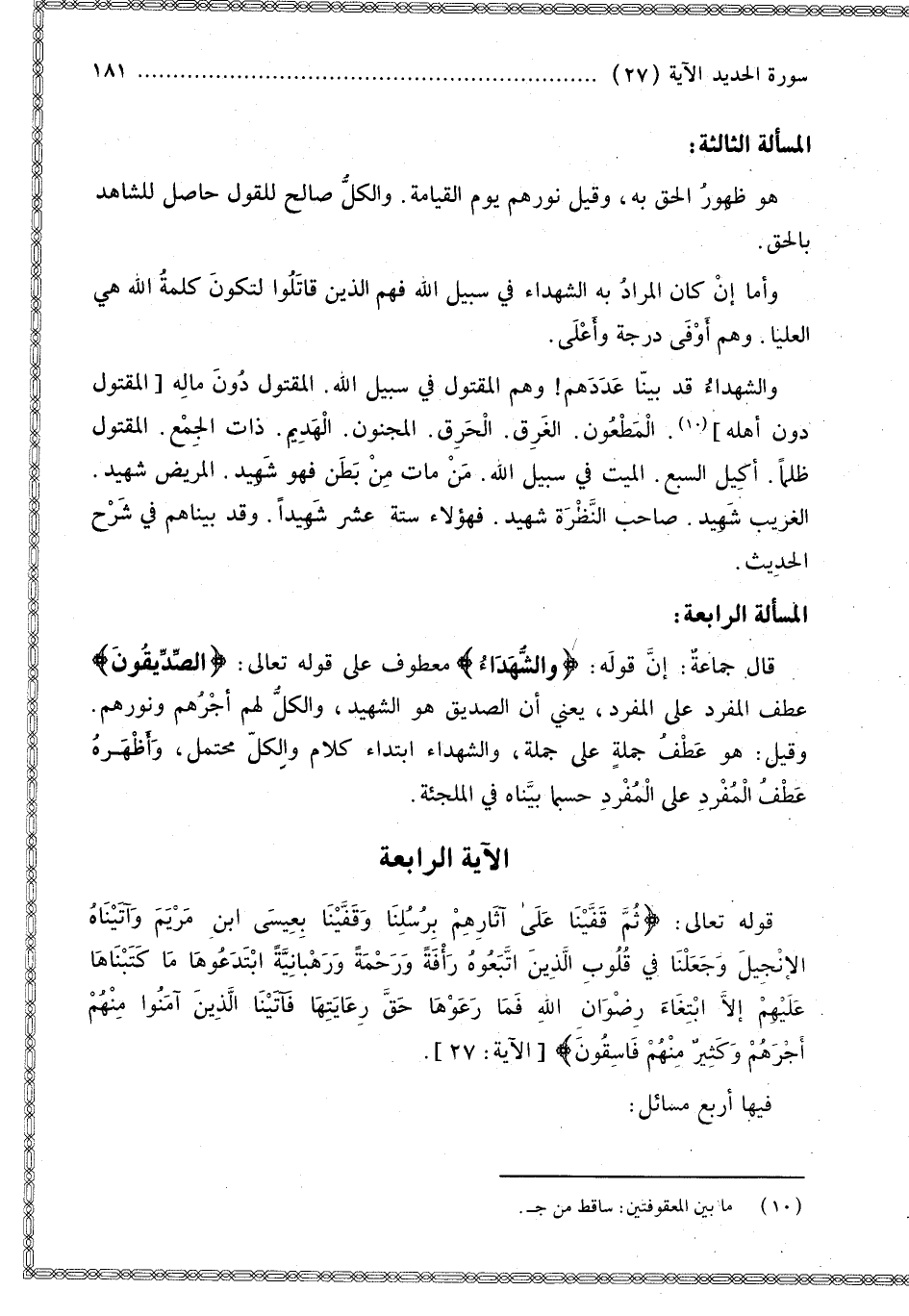 الْمَقْتُولُ ظُلْمًا. أَكِيلُ السَّبْعِ. الْمَيِّتُ فِي سَبِيلِ اللَّهِ. مَنْ مَاتَ مِنْ بَطْنٍ فَهُوَ شَهِيدٌ. الْمَرِيضُ شَهِيدٌ. الْغَرِيبُ شَهِيدٌ. صَاحِبُ النَّظْرَةِ شَهِيدٌ. فَهَؤُلَاءِ سِتَّةَ عَشَرَ شَهِيدًا. وَقَدْ بَيَّنَّاهُمْ فِي شَرْحِ الْحَدِيثِ. الْمَسْأَلَةُ الرَّابِعَةُ قَالَ جَمَاعَةٌ: إنَّ قَوْلَهُ {وَالشُّهَدَاءُ} [الحديد: 19] مَعْطُوفٌ عَلَى قَوْله تَعَالَى: {الصِّدِّيقُونَ} [الحديد: 19] عَطْفُ الْمُفْرَدِ عَلَى الْمُفْرَدِ يَعْنِ ي أَنَّ الصِّدِّيقَ هُوَ الشَّهِيدُ، وَالْكُلُّ لَهُمْ أَجْرُهُمْ وَنُورُهُمْ. وَقِيلَ: هُوَ عَطْفُ جُمْلَةٍ عَلَى جُمْلَةٍ، وَالشُّهَدَاءُ ابْتِدَاءُ كَلَامٍ وَالْكُلُّ مُحْتَمَلٌ، وَأَظْهَرُهُ عَطْفُ الْمُفْرَدِ عَلَى الْمُفْرَدِ حَسْبَمَا بَيَّنَّاهُ فِي الْمُلْجِئَةِ.