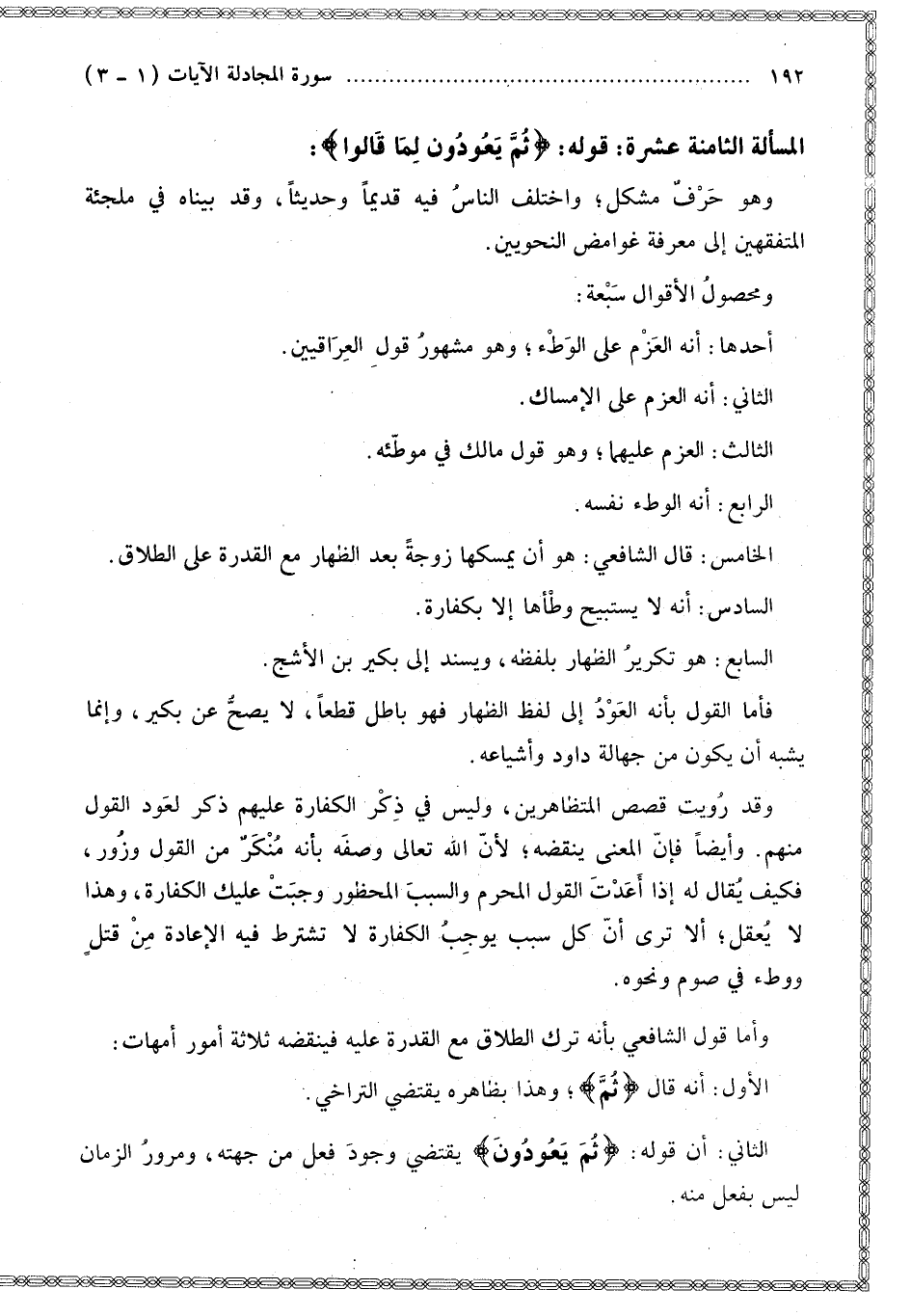 الْمَسْأَلَةُ الثَّامِنَةَ عَشْرَةَ قَوْلُهُ: {ثُمَّ يَعُودُونَ لِمَا قَالُوا} [المجادلة: 3]: وَهُوَ حَرْفٌ مُشْكِلٌ؛ وَاخْتَلَفَ النَّاسُ فِيهِ قَدِيمًا وَحَدِيثًا، وَقَدْ بَيَّنَّاهُ فِي مُلْجِئَةِ الْمُتَفَقِّهِينَ إلَى مَعْرِفَةِ غَوَامِضِ النَّحْوِيِّينَ.