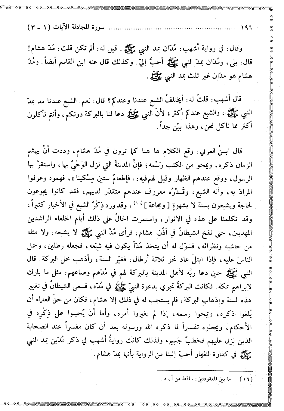 قَالَ النَّبِيُّ - صَلَّى اللَّهُ عَلَيْهِ وَسَلَّمَ - حِينَ دَعَا رَبَّهُ لِأَهْلِ الْمَدِينَةِ بِالْبَرَكَةِ لَهُمْ فِي مُدِّهِمْ وَصَاعِهِمْ: مِثْلَ مَا بَارَكَ لِإِبْرَاهِيمَ بِمَكَّةَ. فَكَانَتْ الْبَرَكَةُ تَجْرِي بِدَعْوَةِ النَّبِيِّ - صَلَّى اللَّهُ عَلَيْهِ وَسَلَّمَ - فِي مُدِّهِ، فَسَعَى الشَّيْطَانُ فِي تَغْيِيرِ هَذِهِ السُّنَّةِ وَإِذْهَابِ الْبَرَكَةِ، فَلَمْ يَسْتَجِبْ لَهُ فِي ذَلِكَ إلَّا هِشَامٌ، فَكَانَ مِنْ حَقِّ الْعُلَمَاءِ أَنْ يُلْغُوا ذِكْرَهُ، وَيَمْحُوا رَسْمَهُ، وَإِذَا لَمْ يُغَيِّرُوا أَمْرَهُ، وَأَمَّا أَنْ يُحِيلُوا عَلَى ذِكْرِهِ فِي الْأَحْكَامِ، وَيَجْعَلُوهُ تَفْسِيرًا لِمَا ذَكَرَهُ اللَّهُ وَرَسُولُهُ بَعْدَ أَنْ كَانَ مُفَسِّرًا عِنْدَ الصَّحَابَةِ الَّذِينَ نَزَلَ عَلَيْهِمْ فَخَطْبٌ جَسِيمٌ؛ وَلِذَلِكَ كَانَتْ رِوَايَةُ أَشْهَبَ فِي ذِكْرِ مُدَّيْنِ بِمُدِّ النَّبِيِّ - صَلَّى اللَّهُ عَلَيْهِ وَسَلَّمَ - فِي كَفَّارَةِ الظِّهَارِ أَحَبَّ إلَيْنَا مِنْ الرِّوَايَةِ بِأَنَّهَا بِمُدِّ هِشَامٍ.