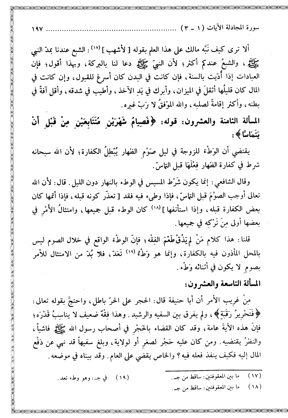 الْمَسْأَلَةُ الثَّامِنَةُ وَالْعِشْرُونَ قَوْلُهُ: {فَصِيَامُ شَهْرَيْنِ مُتَتَابِعَيْنِ مِنْ قَبْلِ أَنْ يَتَمَاسَّا} [المجادلة: 4] يَقْتَضِي أَنَّ الْوَطْءَ لِلزَّوْجَةِ فِي لَيْلِ صَوْمِ الظِّهَارِ يُبْطِلُ الْكَفَّارَةَ؛ لِأَنَّ اللَّهَ سُبْحَانَهُ شَرَطَ فِي كَفَّارَةِ الظِّهَارِ فِعْلَهَا قَبْلِ التَّمَاسِّ.