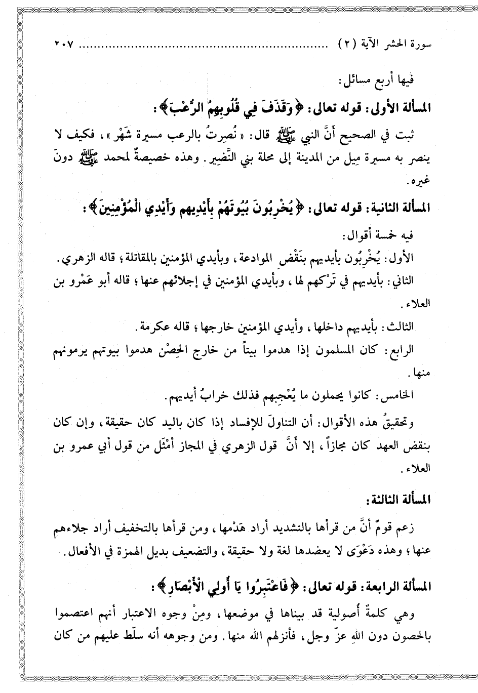 فِيهَا أَرْبَعُ مَسَائِلَ: الْمَسْأَلَةُ الْأُولَى قَوْله تَعَالَى: {وَقَذَفَ فِي قُلُوبِهِمُ الرُّعْبَ} [الحشر: 2]: ثَبَتَ فِي الصَّحِيحِ أَنَّ النَّبِيَّ - صَلَّى اللَّهُ عَلَيْهِ وَسَلَّمَ - قَالَ: نُصِرْت بِالرُّعْبِ مَسِيرَةَ شَهْرٍ، فَكَيْفَ لَا يُنْصَرُ بِهِ مَسِيرَةَ مَيْلٍ مِنْ الْمَدِينَةِ إلَى مَحَلَّةِ بَنِي النَّضِيرِ. وَهَذِهِ خِصِّيصَةٌ لِمُحَمَّدٍ - صَلَّى اللَّهُ عَلَيْهِ وَسَلَّمَ - دُونَ غَيْرِهِ.