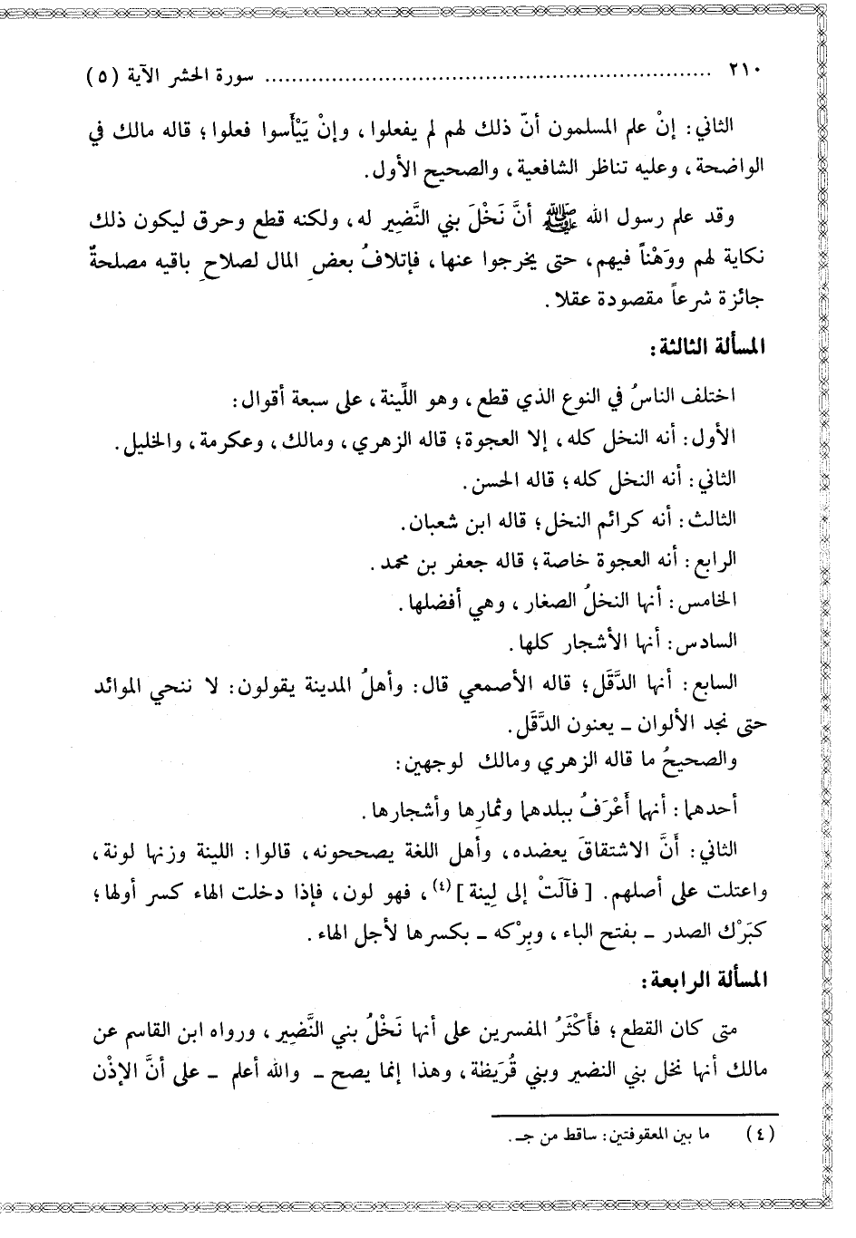 الْمَسْأَلَةُ الرَّابِعَةُ مَتَى كَانَ الْقَطْعُ؛ فَأَكْثَرُ الْمُفَسِّرِينَ عَلَى أَنَّهَا نَخْلُ بَنِي النَّضِيرِ، وَرَوَاهُ ابْنُ الْقَاسِمِ عَنْ مَالِكٍ أَنَّهَا نَخْلُ بَنِي النَّضِيرِ وَبَنِي قُرَيْظَةَ، وَهَذَا إنَّمَا يَصِحُّ وَاَللَّهُ أَعْلَمُ عَلَى أَنَّ الْإِذْنَ