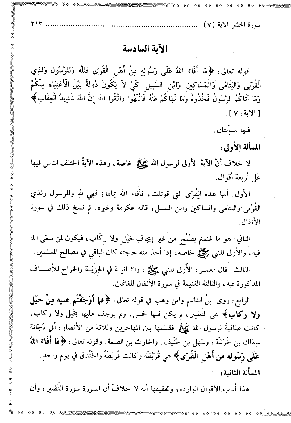فِيهَا مَسْأَلَتَانِ: الْمَسْأَلَةُ الْأُولَى لَا خِلَافَ أَنَّ الْآيَةَ الْأُولَى لِرَسُولِ اللَّهِ - صَلَّى اللَّهُ عَلَيْهِ وَسَلَّمَ - خَاصَّةً، وَهَذِهِ الْآيَةُ اخْتَلَفَ النَّاسُ فِيهَا عَلَى أَرْبَعَةِ أَقْوَالٍ: الْأَوَّلُ أَنَّهَا هَذِهِ الْقُرَى الَّتِي قُوتِلَتْ، فَأَفَاءَ اللَّهُ بِمَالِهَا؛ فَهِيَ لِلَّهِ وَلِلرَّسُولِ وَلِذِي الْقُرْبَى وَالْيَتَامَى وَالْمَسَاكِينِ وَابْنِ السَّبِيلِ؛ قَالَهُ عِكْرِمَةُ وَغَيْرُهُ، ثُمَّ نُسِخَ ذَلِكَ فِي سُورَةِ الْأَنْفَالِ.