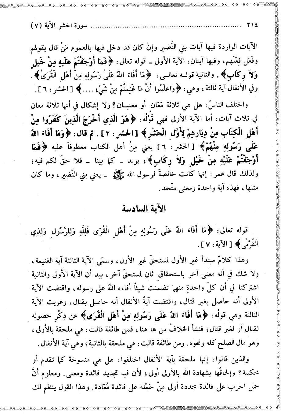 الْآيَاتِ الْوَارِدَةَ فِيهَا آيَاتُ بَنِي النَّضِيرِ وَإِنْ كَانَ قَدْ دَخَلَ فِيهَا بِالْعُمُومِ مَنْ قَالَ بِقَوْلِهِمْ وَفَعَلَ فِعْلَهُمْ، وَفِيهَا آيَتَانِ: الْآيَةُ الْأُولَى قَوْله تَعَالَى: {فَمَا أَوْجَفْتُمْ عَلَيْهِ مِنْ خَيْلٍ وَلا رِكَابٍ} [الحشر: 6]. وَالثَّانِيَةُ قَوْله تَعَالَى: {مَا أَفَاءَ اللَّهُ عَلَى رَسُولِهِ مِنْ أَهْلِ الْقُرَى} [الحشر: 7].