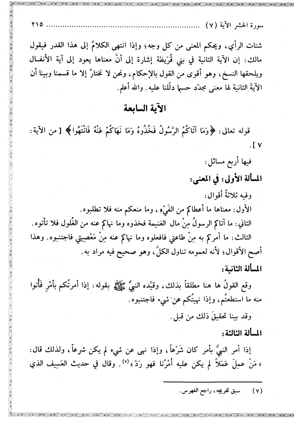 [الْآيَة السَّابِعَة قَوْله تَعَالَى وَمَا آتَاكُمْ الرَّسُولُ فَخُذُوهُ وَمَا نَهَاكُمْ عَنْهُ فَانْتَهُوا]