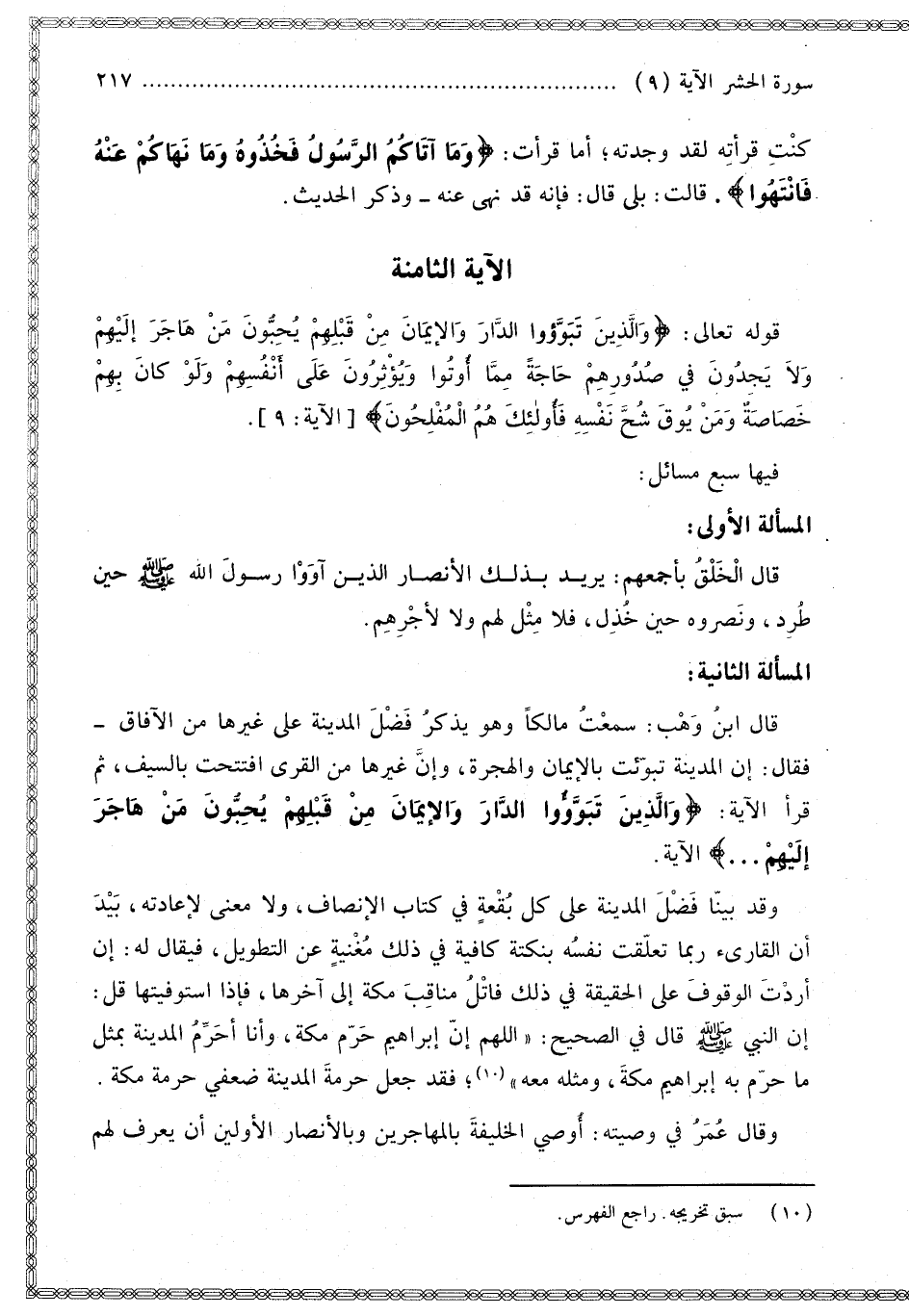 الْمَسْأَلَةُ الثَّانِيَةُ قَالَ ابْنُ وَهْبٍ: سَمِعْت مَالِكًا وَهُوَ يَذْكُرُ فَضْلَ الْمَدِينَةِ عَلَى غَيْرِهَا مِنْ الْآفَاقِ فَقَالَ: إنَّ الْمَدِينَةَ تُبُوِّئَتْ بِالْإِيمَانِ وَالْهِجْرَةِ، وَإِنَّ غَيْرَهَا مِنْ الْقُرَى اُفْتُتِحَتْ بِالسَّيْفِ ثُمَّ قَرَأَ الْآيَةَ: {وَالَّذِينَ تَبَوَّءُوا الدَّارَ وَالإِيمَانَ مِنْ قَبْلِهِمْ يُحِبُّونَ مَنْ هَاجَرَ إِلَيْهِمْ} [الحشر: 9] الْآيَةَ.